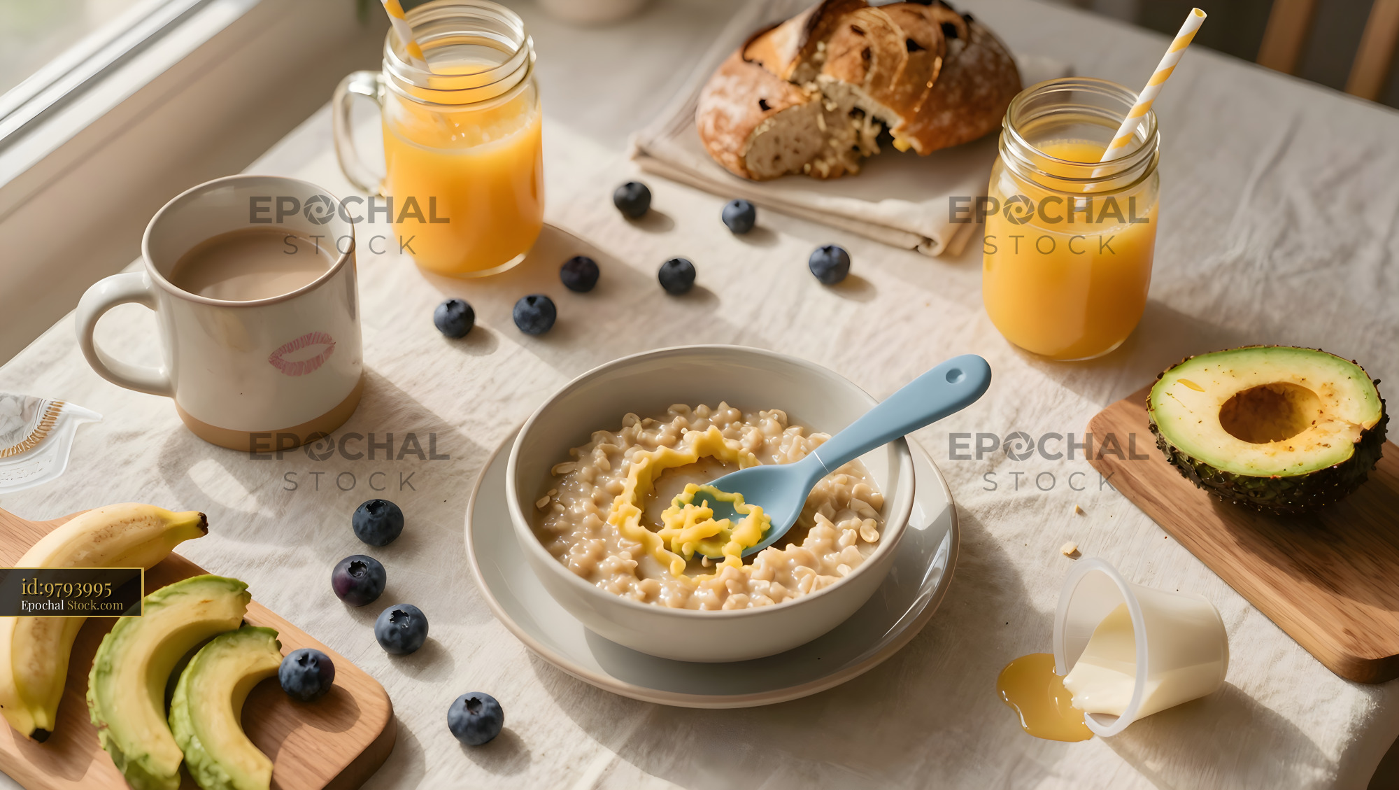 Breakfast scene with food, drinks, and fruits on a table Premium Stock Photo