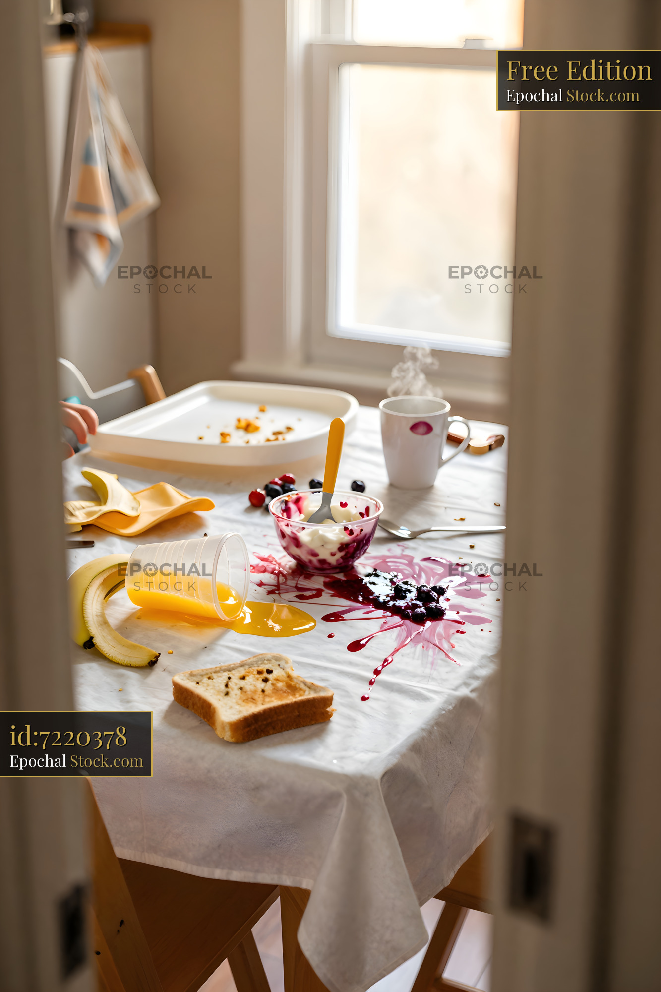 Breakfast table with spilled juice and scattered food items Free Premium Stock Image