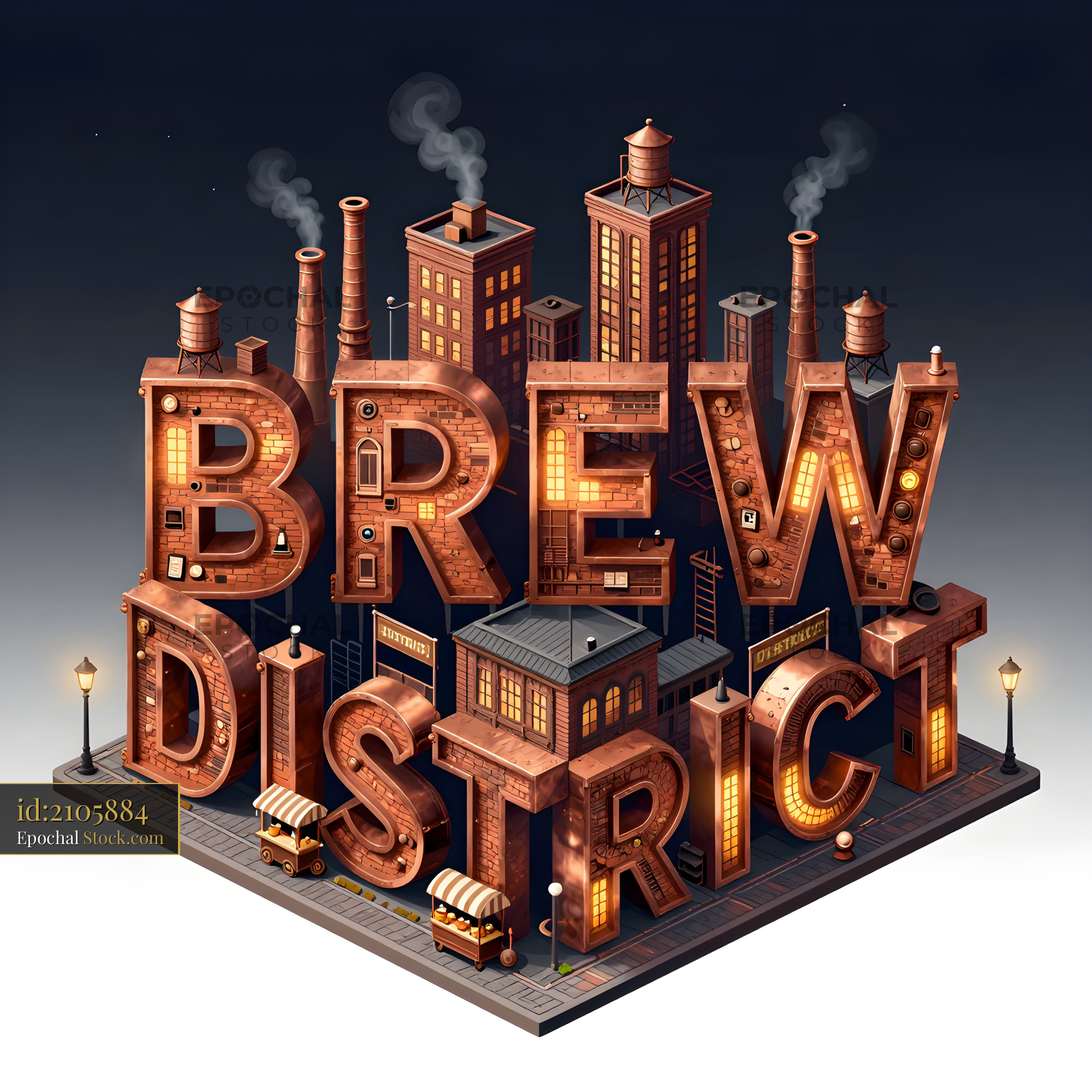The Brew District features large lettered signs in front of buildings. Smoke rises from factory stacks. Street lights brighten the area. It is nighttime with a city backdrop.