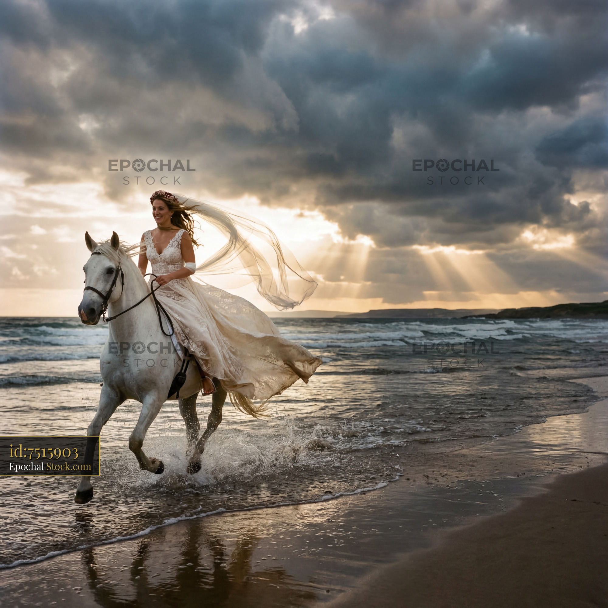 A bride in a white dress rides a white horse along the beach. Waves crash on the shore as clouds fill the sky during sunset. The bride's veil flows in the wind.