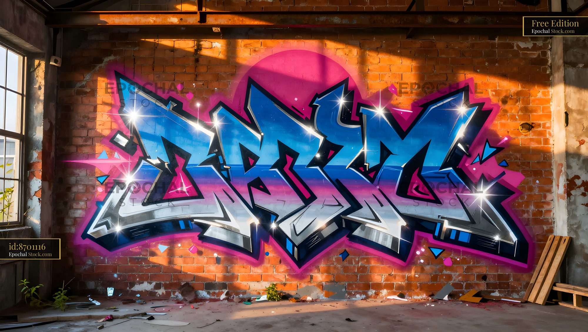 A large piece of graffiti covers a brick wall inside an abandoned building. The artwork features bold letters and bright colors. Sunlight comes through the windows. There is debris on the floor.