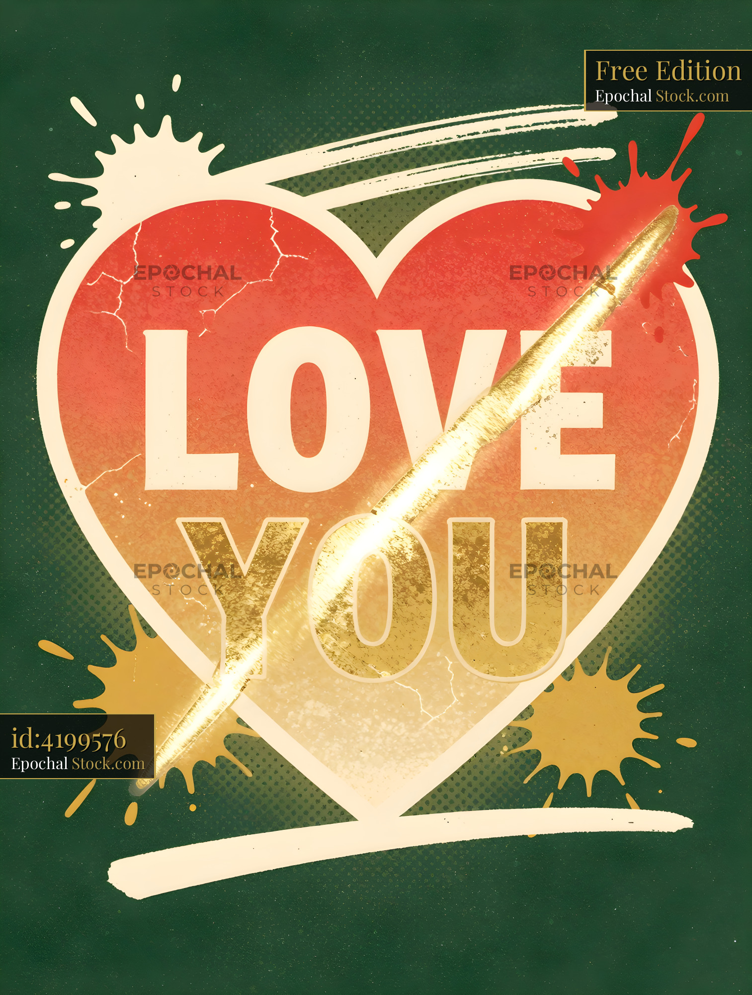 A heart shape shows the words love you. The design uses bright colors like red, gold, and green. The heart has paint splashes and lines around it. This artwork seems playful and fun.