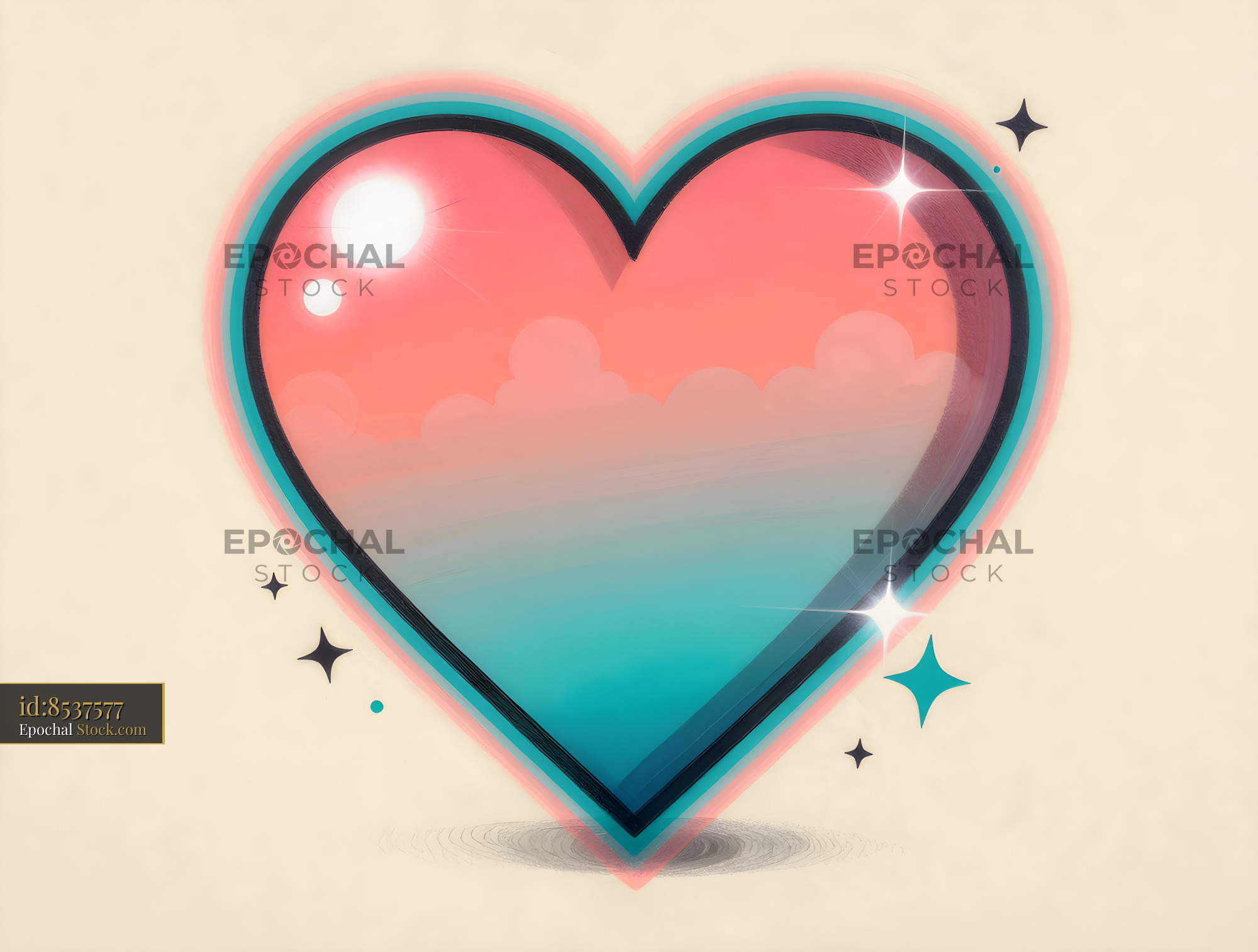 A large heart is shown in bright colors with a gradient effect. It has sparkles around it. The design features soft clouds in the background. This shows a playful theme and joy.