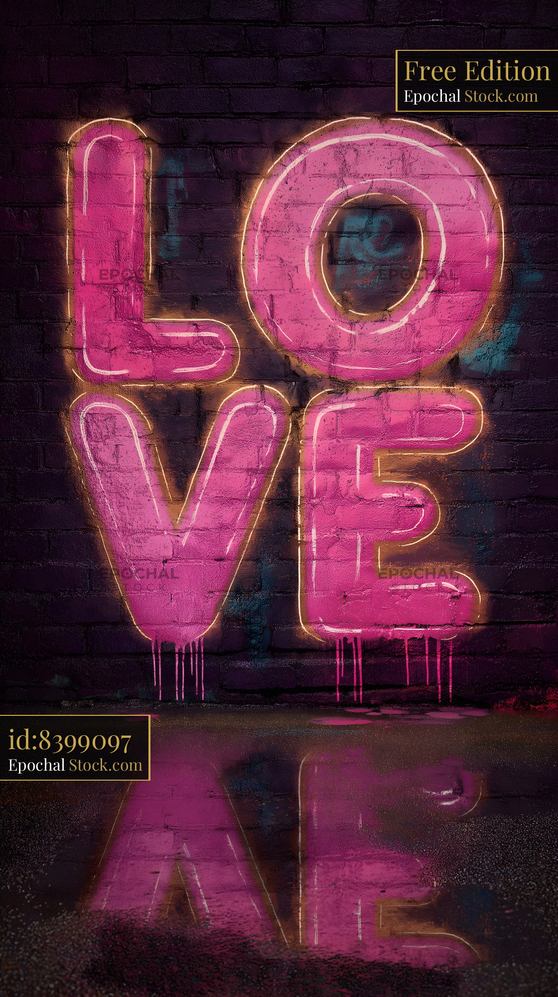 A large pink love sign is displayed on a brick wall. The sign is lit up and reflects on wet pavement. This scene takes place in an urban area during the night.