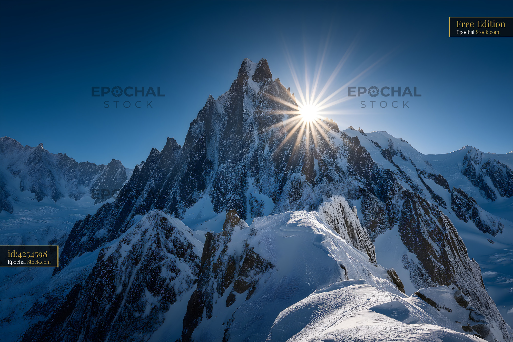 Bright sun rising over snowy mountain peak with sharp rocks Free Premium Stock Photo