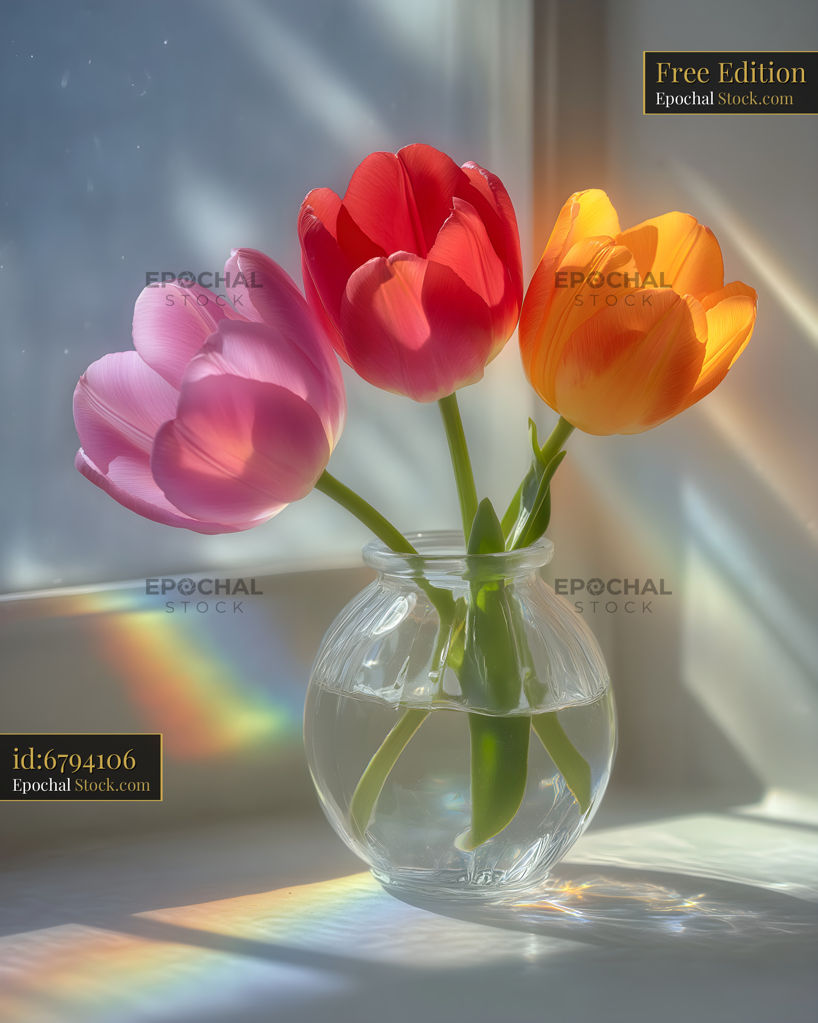 Three tulips of different colors sit in a clear glass vase on a windowsill. Sunlight shines through the window, creating colorful reflections on the surface.