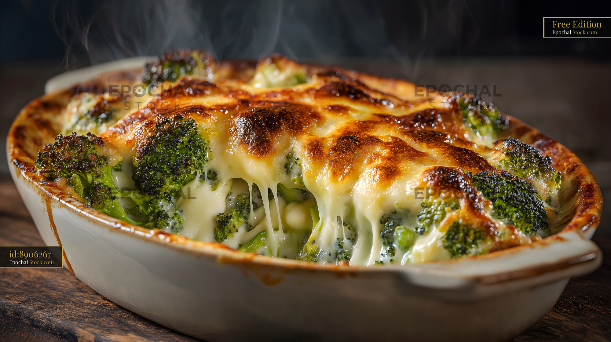 Broccoli and cheese casserole sits on a wooden table. Steam rises from the dish. The broccoli and cheese are melted and bubbly, ready to eat. It's a cozy meal for any gathering.