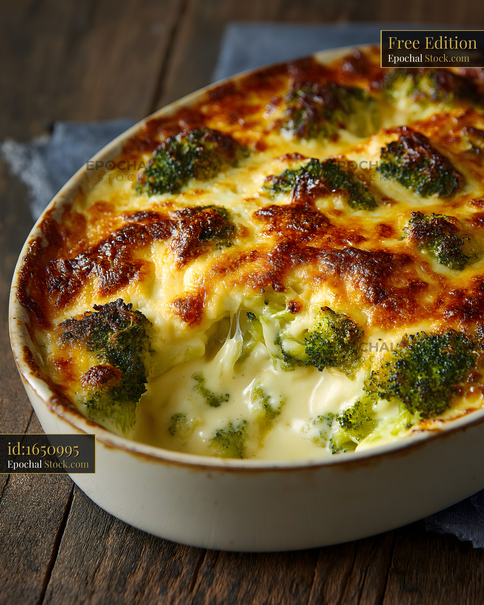 Broccoli baked dish on wooden table with melted cheese Free Premium Stock Photo