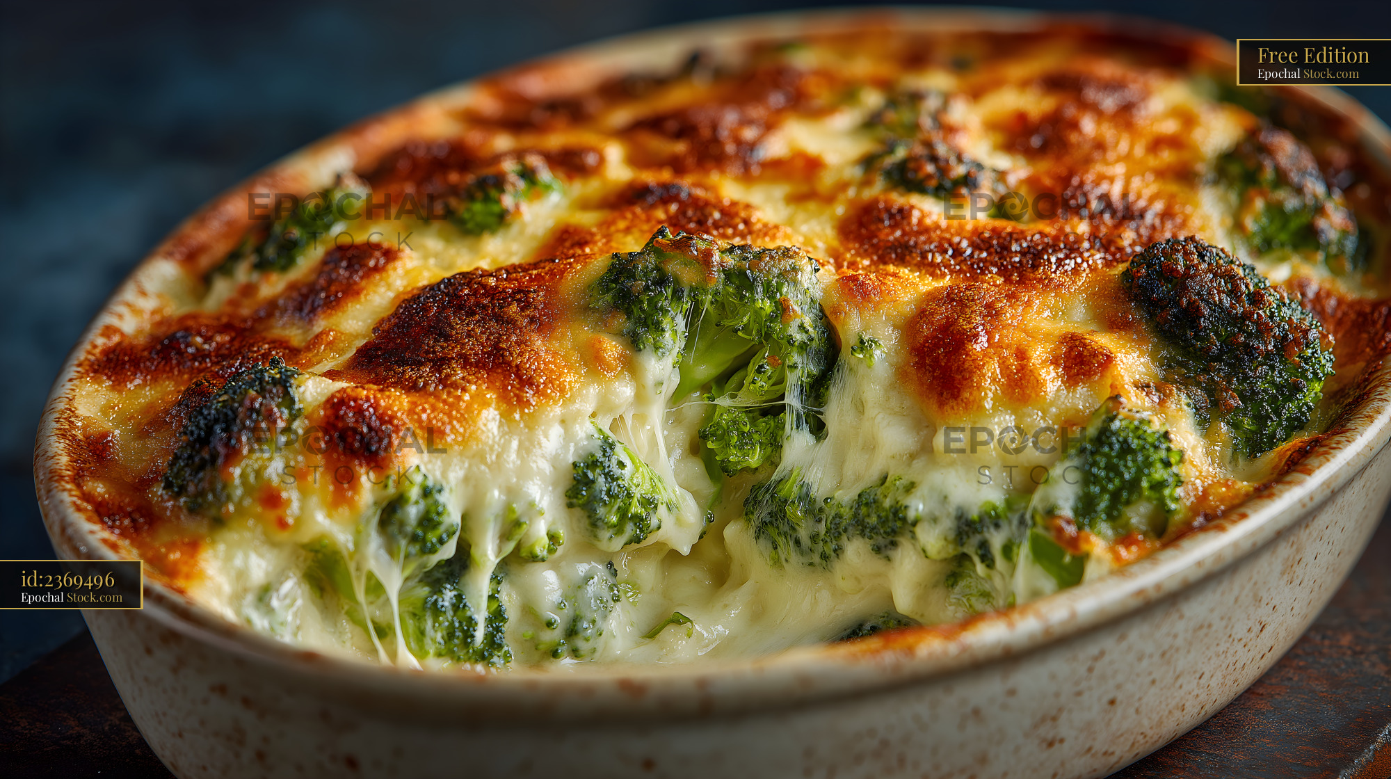 Broccoli is baked in a creamy cheese sauce until it turns golden brown. This dish is served in a round baking dish and looks delicious and appetizing.