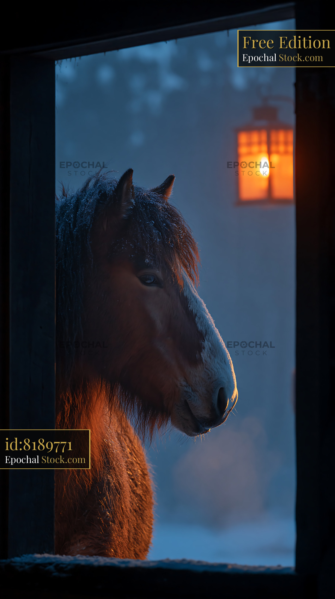 A majestic brown horse with frost on its mane gazes out from a dark stable into the blue winter night, illuminated by the warm glow of a hanging lantern.