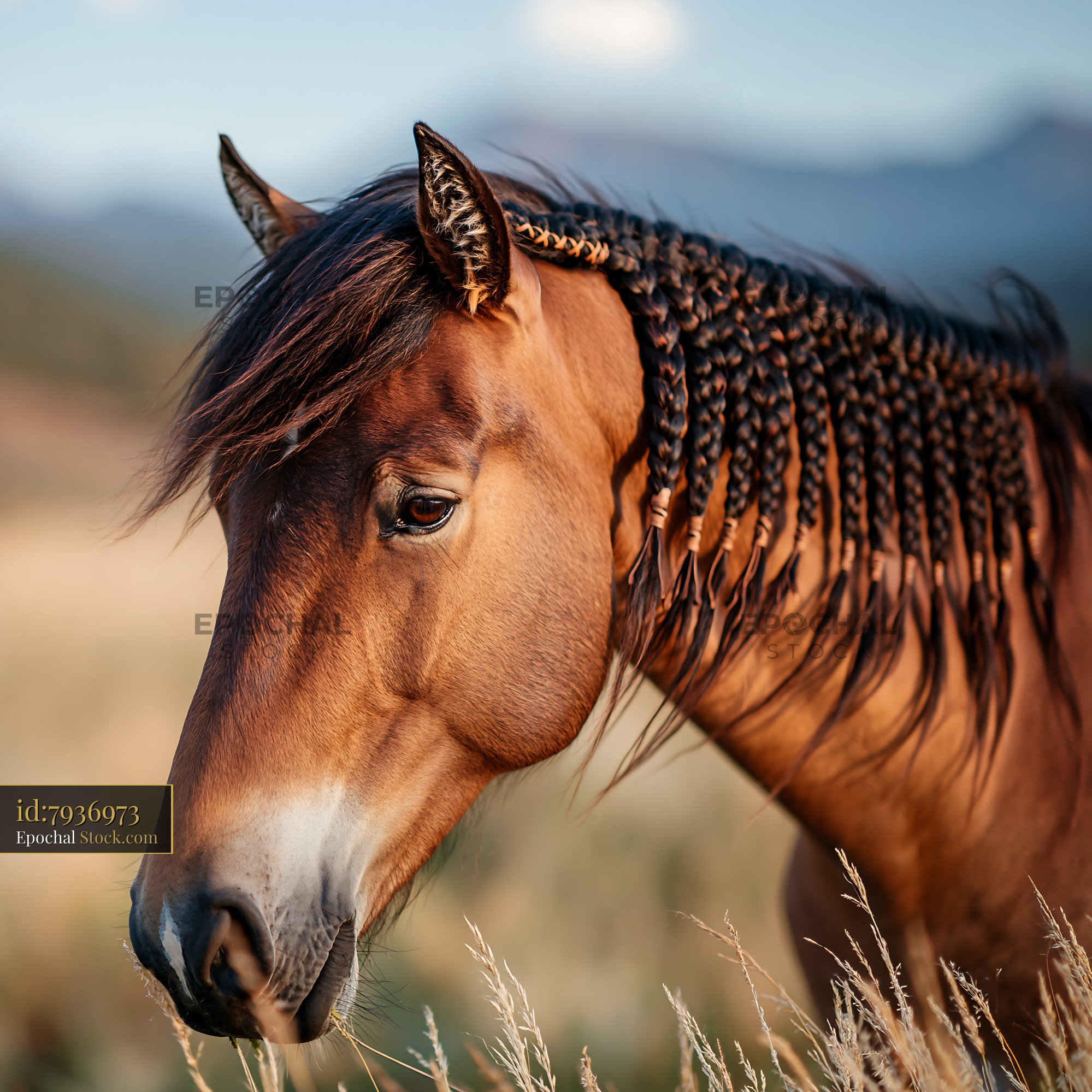 A majestic bay horse with a meticulously braided mane stands in a golden field at sunset, evoking themes of equestrian care, beauty, and the bond between human and animal.