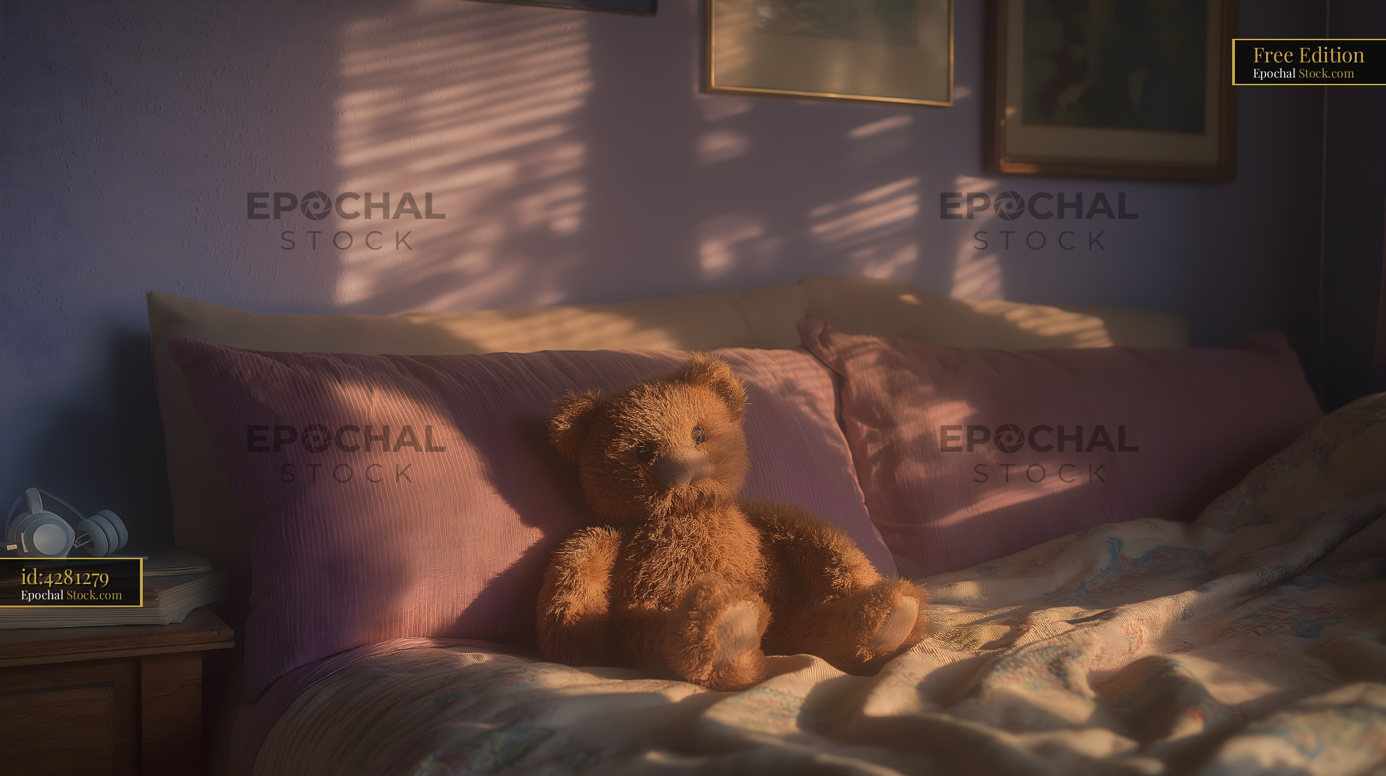 Brown teddy bear sitting on bed with purple pillows Free Premium Stock Image