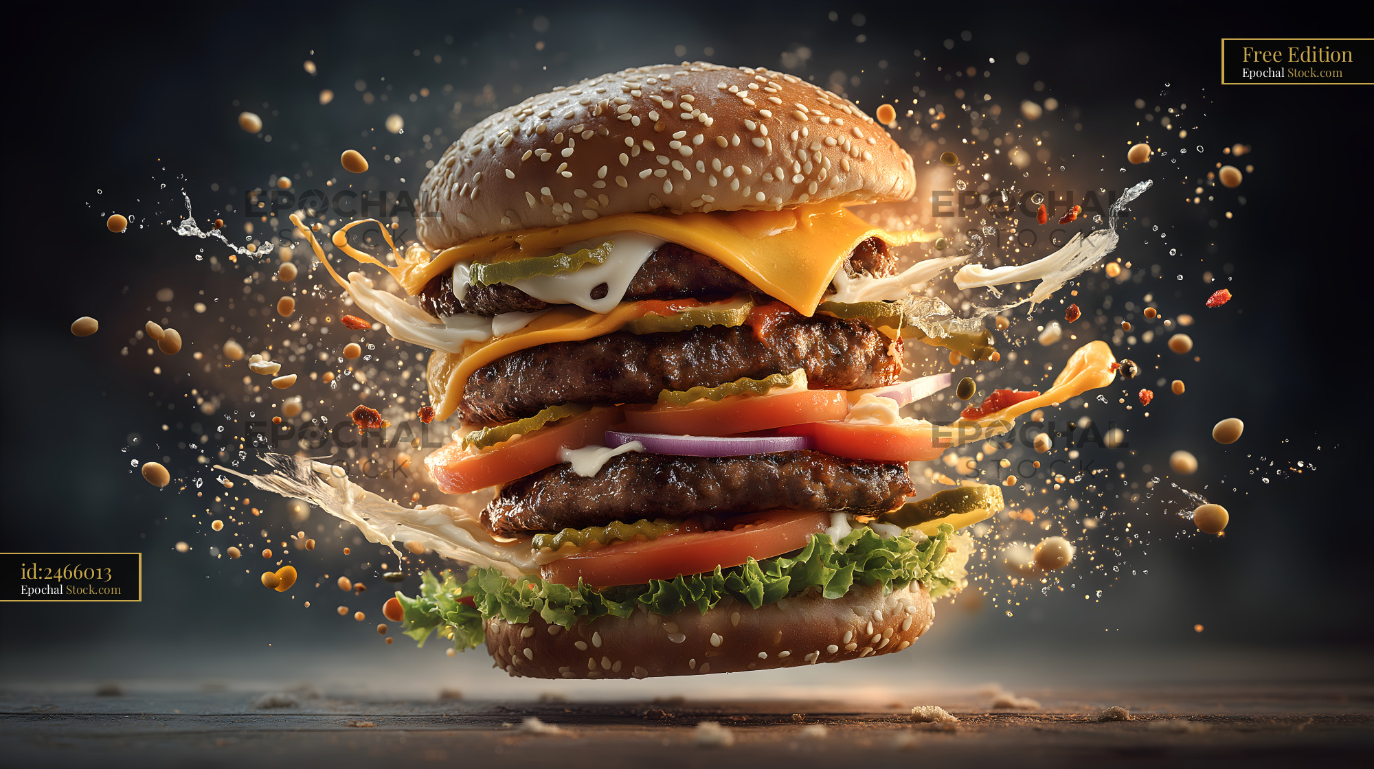 A large burger with several layers includes patties, cheese, lettuce, tomato, and sauce. The burger has splatter effects around it, showing sauce and toppings flying.