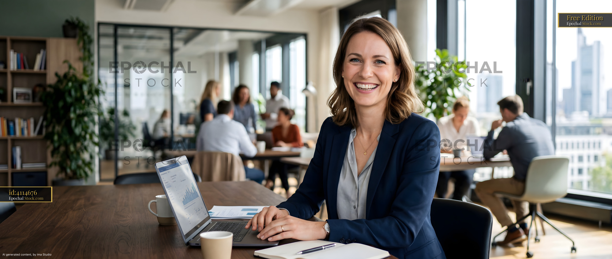 A woman sits at a table in an office with large windows. She smiles while working on a laptop. Other people are engaged in discussions around her. It is daytime in an urban environment.
