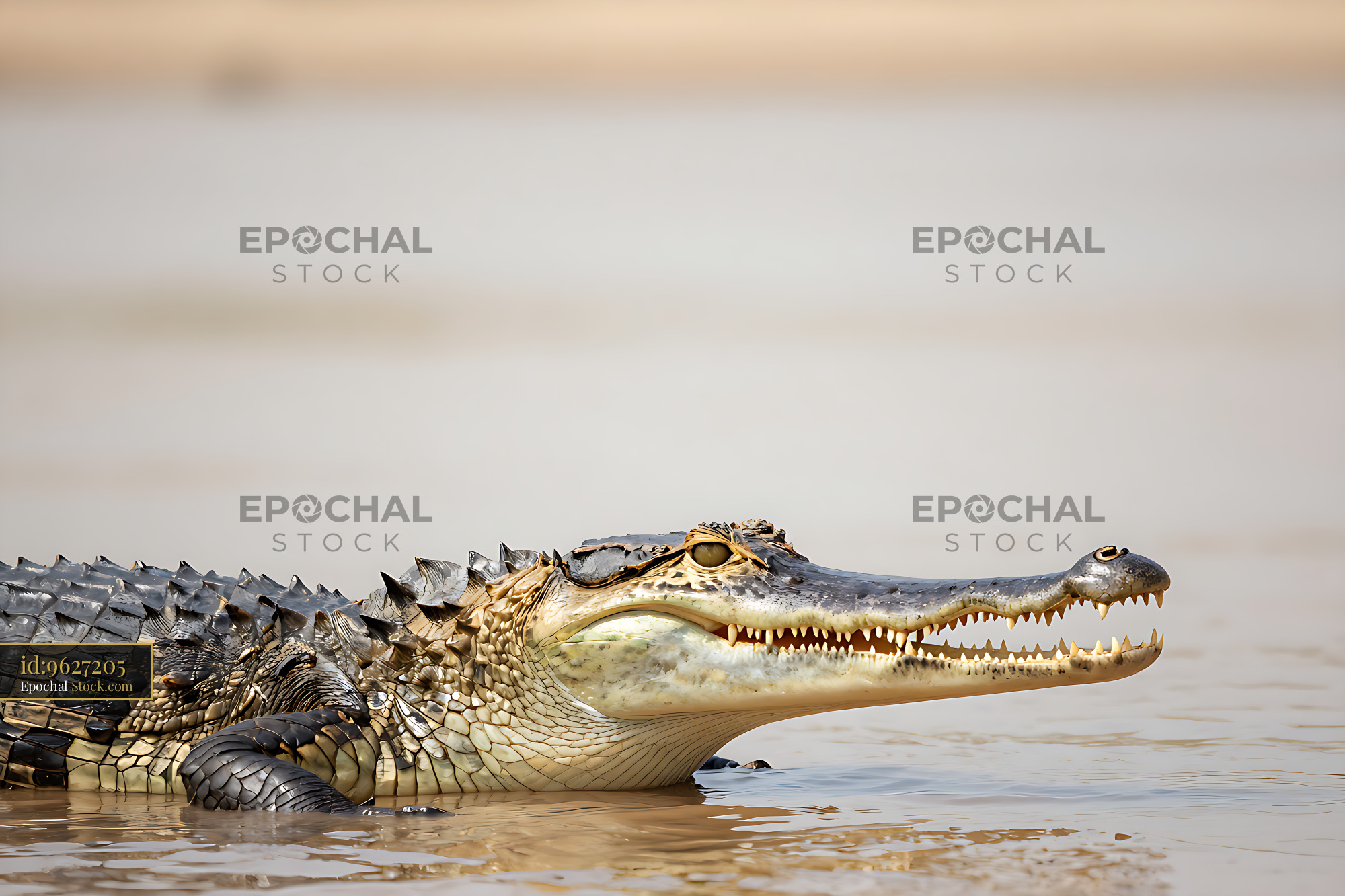 A wild caiman lies alert in the shallow, muddy water of a riverbank, its jaws slightly parted, evoking a sense of primal danger and prehistoric survival.