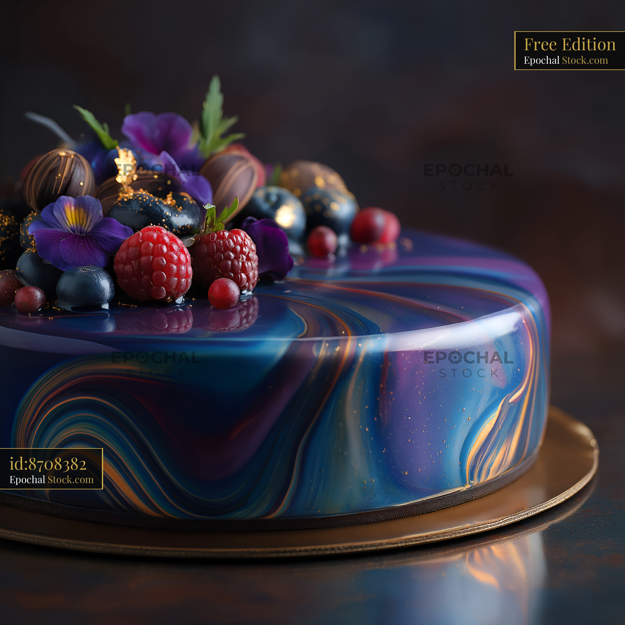 A round cake sits on a gold plate. It is topped with colorful chocolate, berries, and flowers. The cake has a shiny surface and is placed on a dark background.