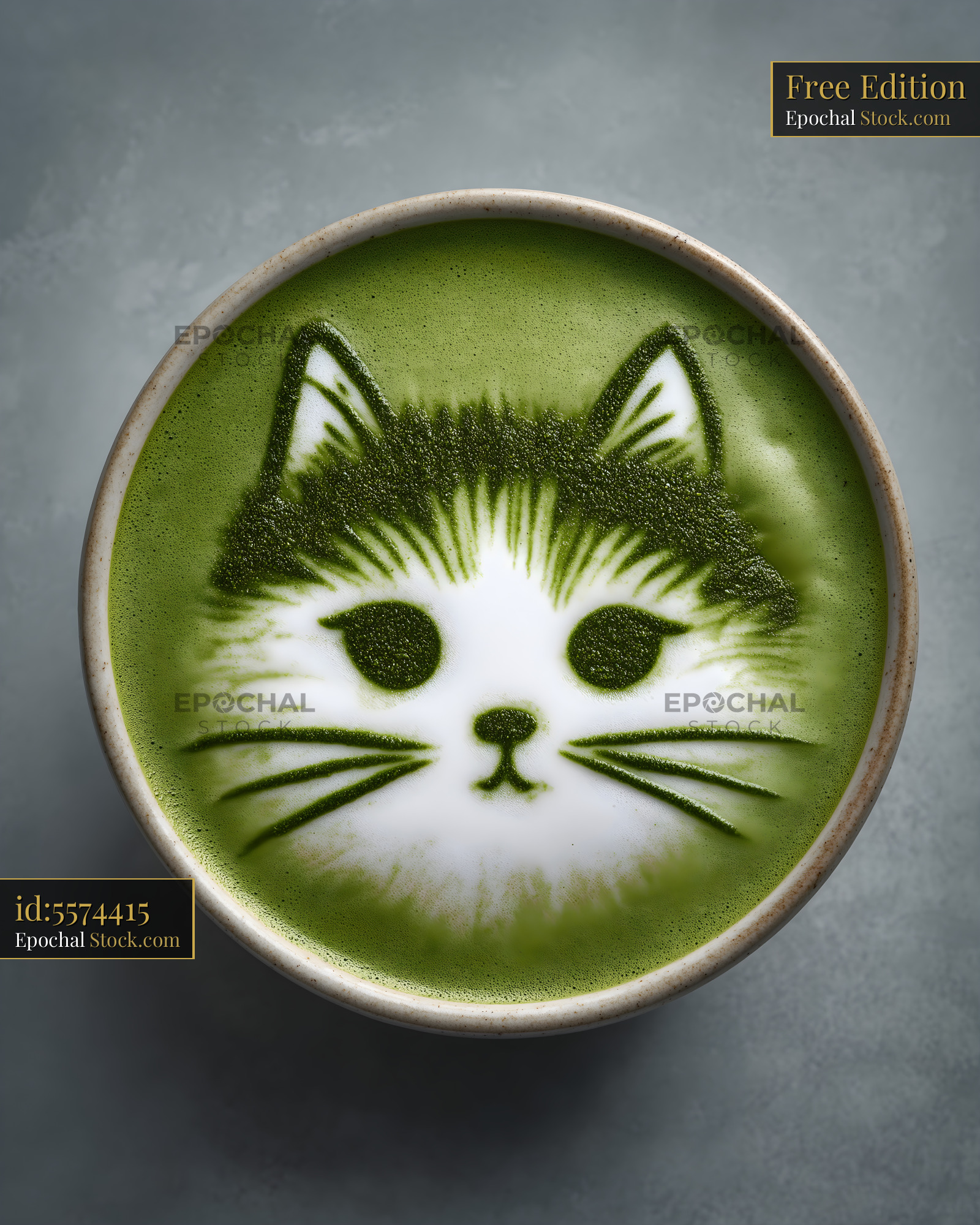 A matcha latte shows a cat face design created with milk foam. The drink sits on a gray surface. The image captures the art of latte making in a coffee shop setting.