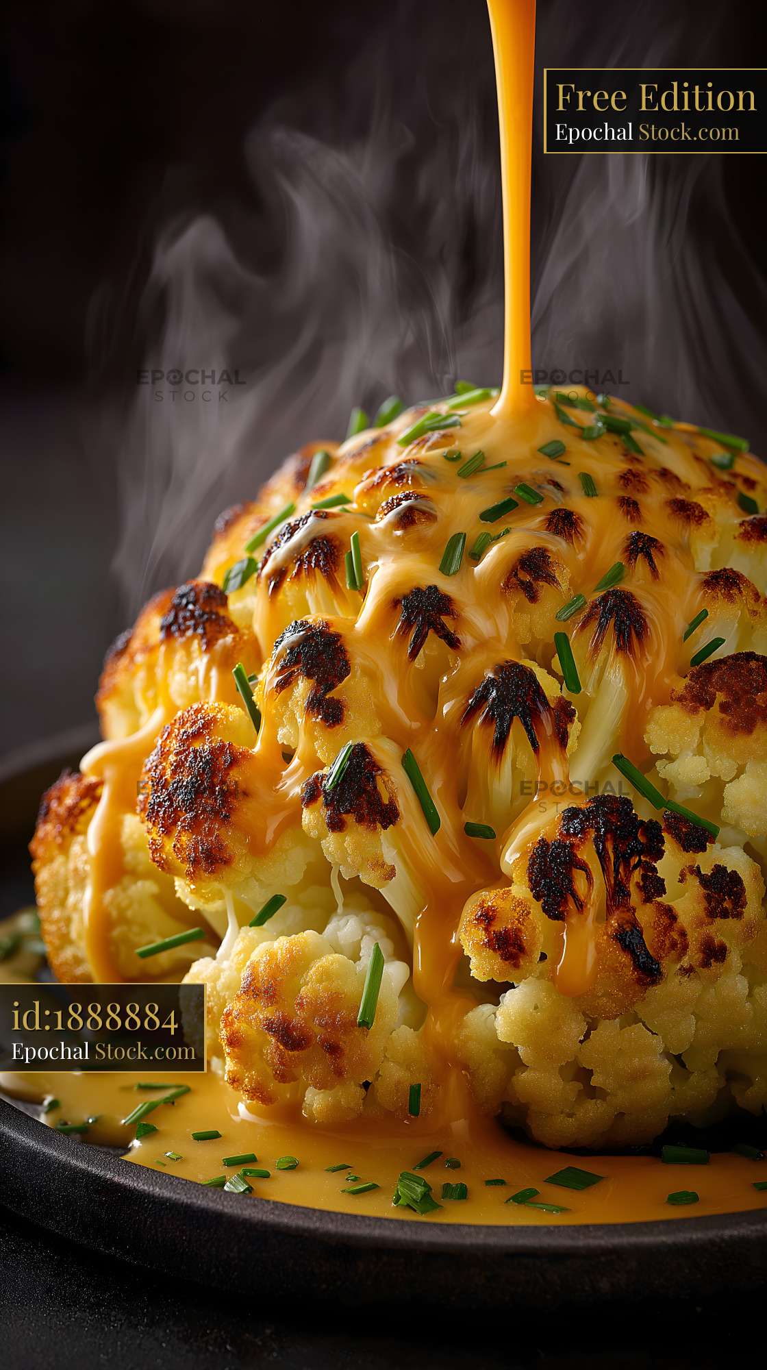 A whole cauliflower is cooked and placed on a plate. Hot cheese sauce is poured over it, creating steam. Chopped chives are sprinkled on top, inside a kitchen.
