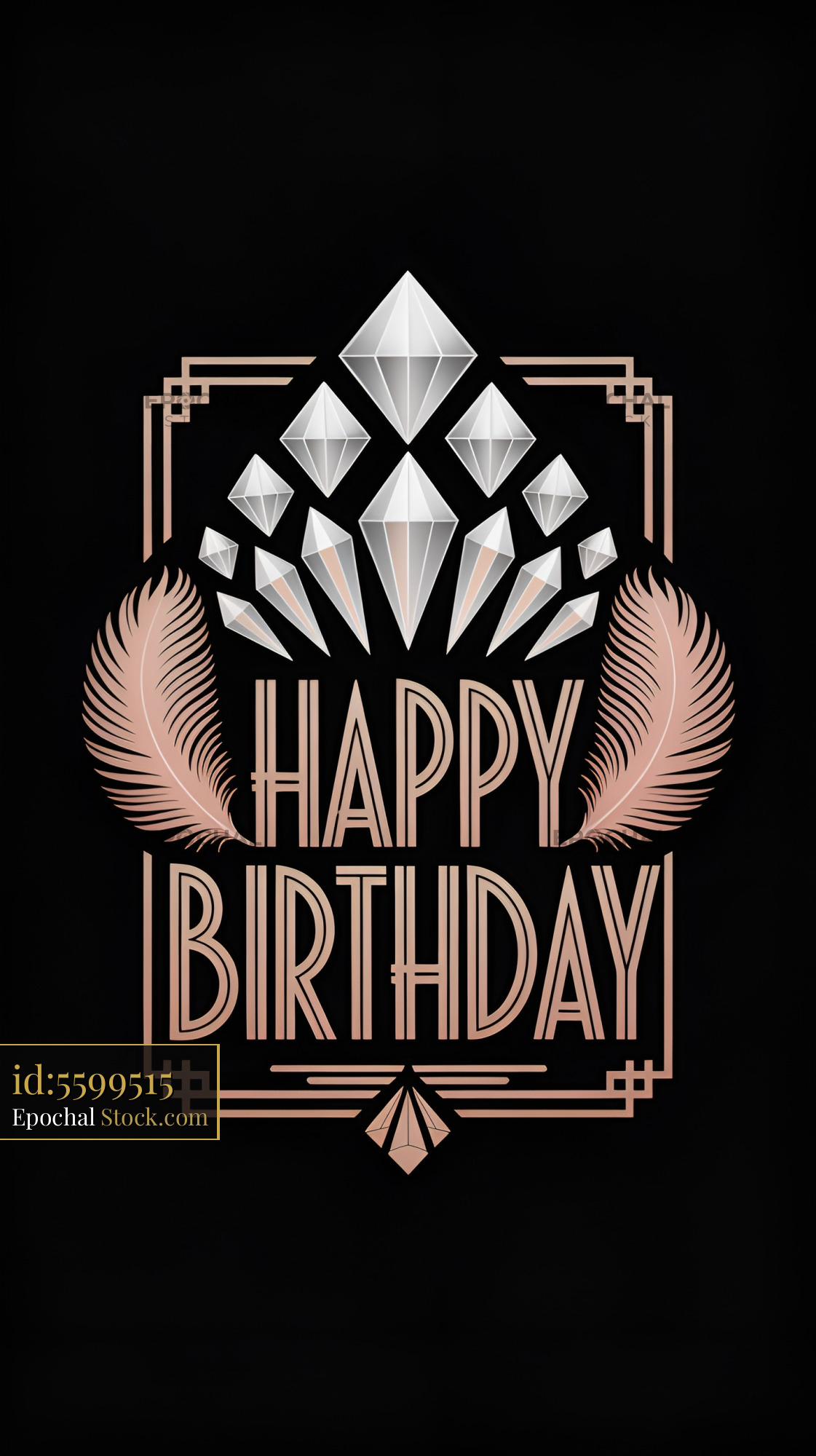 A birthday design features diamonds and elegant lines. It has a black background with the text happy birthday in bold letters. This design is great for invitations or decorations.
