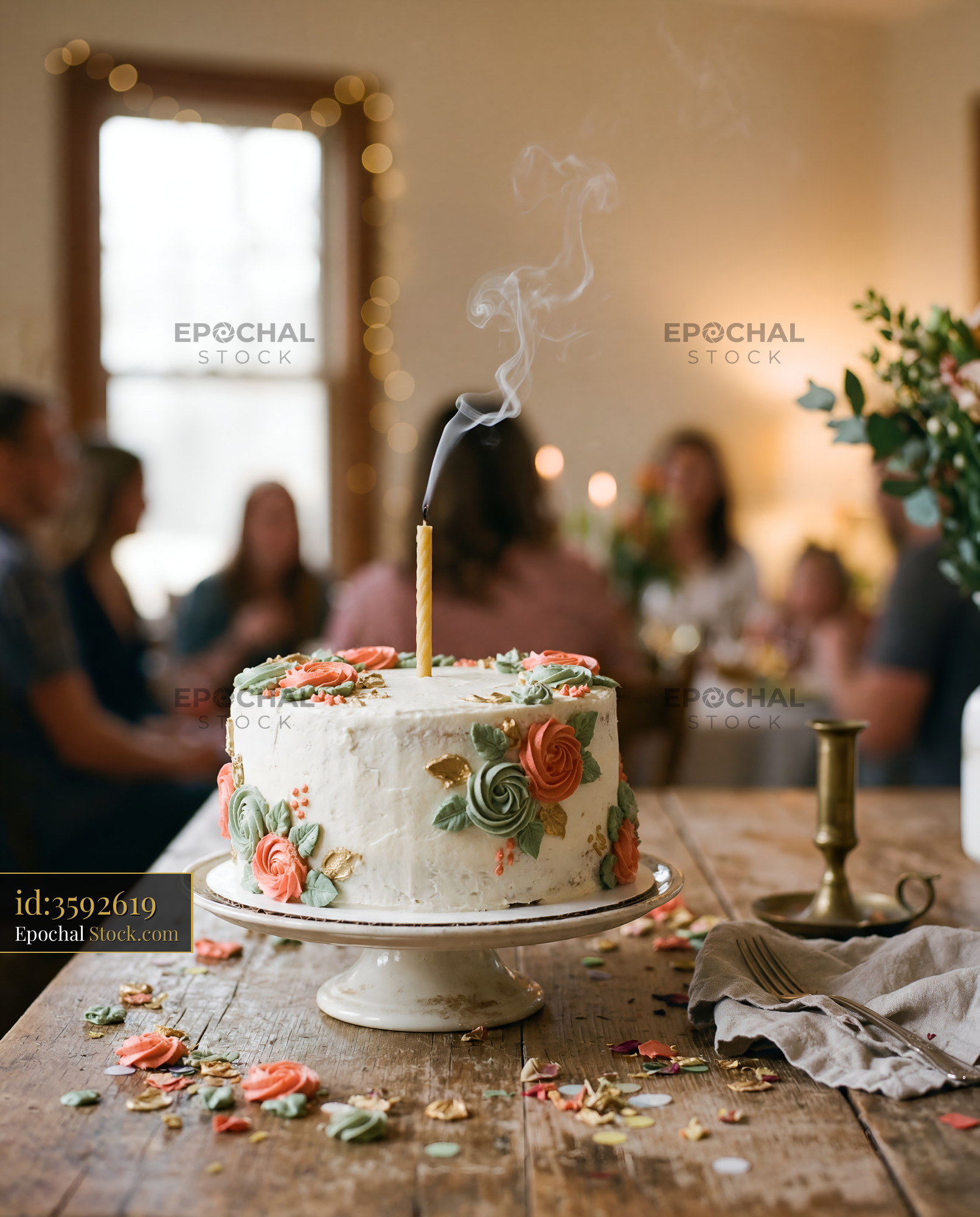 People are sitting around a table enjoying a celebration. A cake with a candle is on display. There is smoke rising from the candle while decorations and friends add to the festive mood.