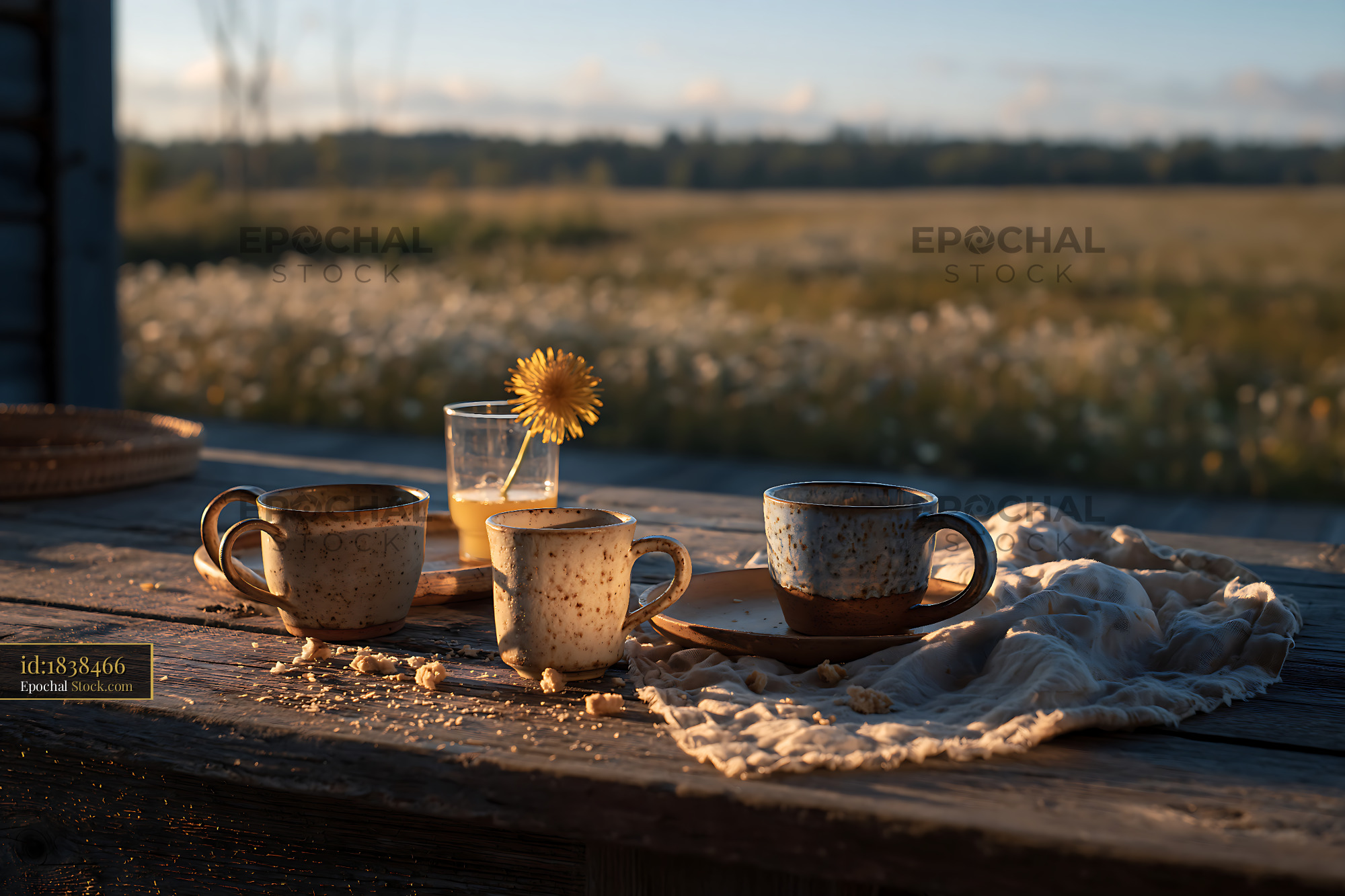 A peaceful outdoor scene with handmade ceramic cups and a dandelion on a weathered wooden table, evoking themes of slow living and tranquility in a summer meadow.