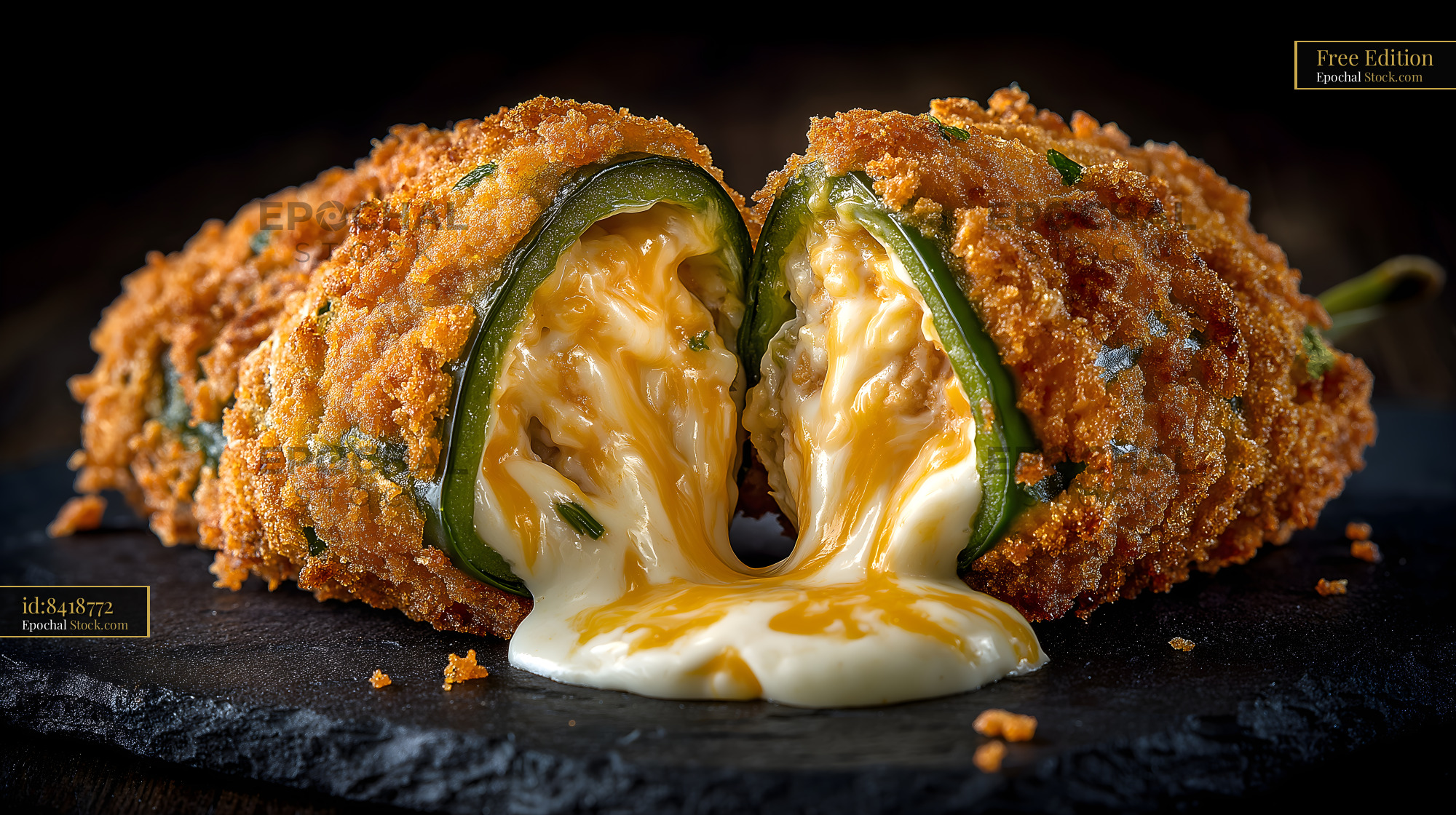 Crispy jalapeno peppers are sliced open to reveal gooey cheese inside. The peppers are golden brown and placed on a dark surface that enhances the food's texture and color.