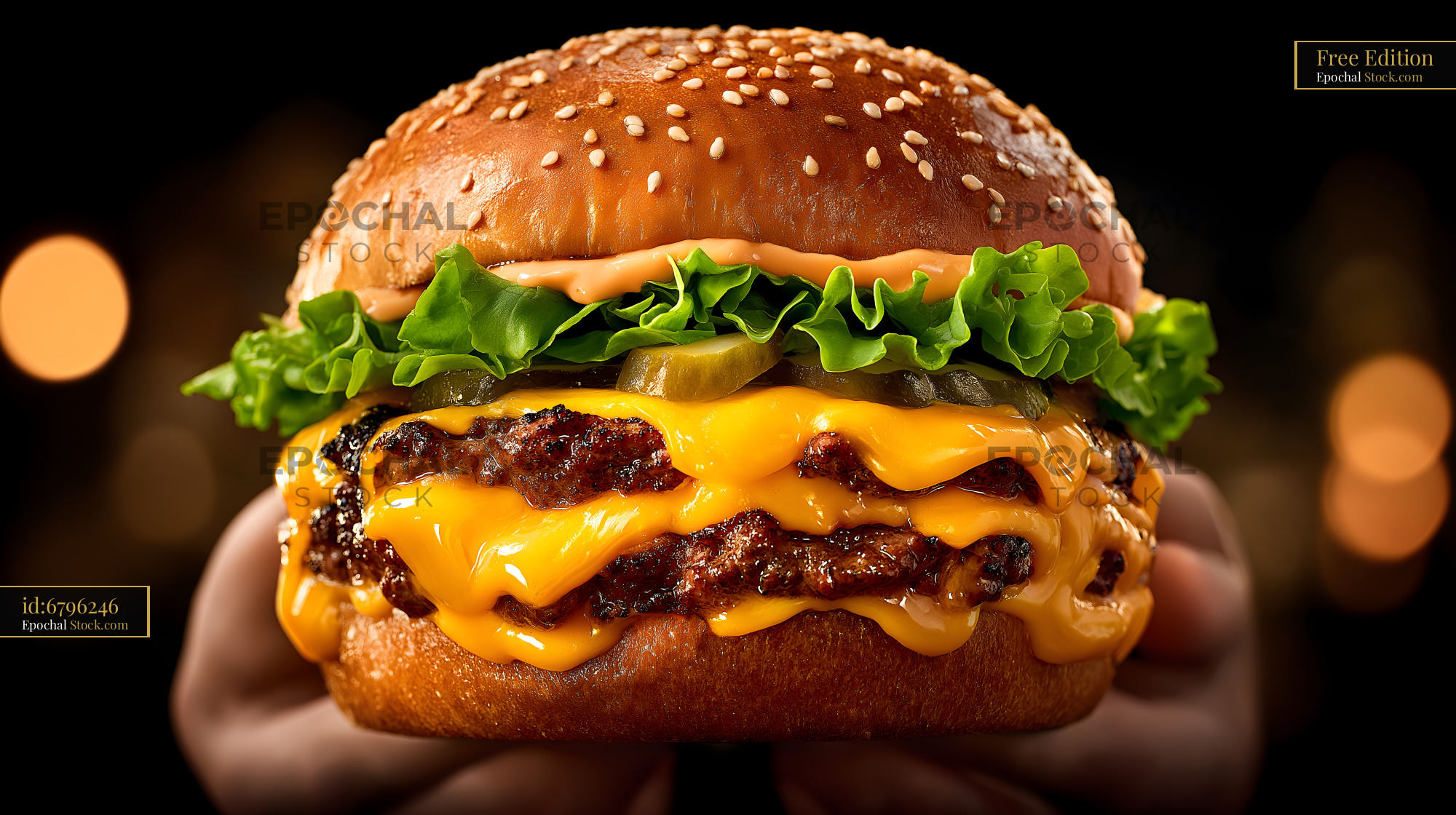 A person holds a loaded cheeseburger with two beef patties, melted cheese, lettuce, and pickles. The background shows a blurred light setting, focusing on the food.