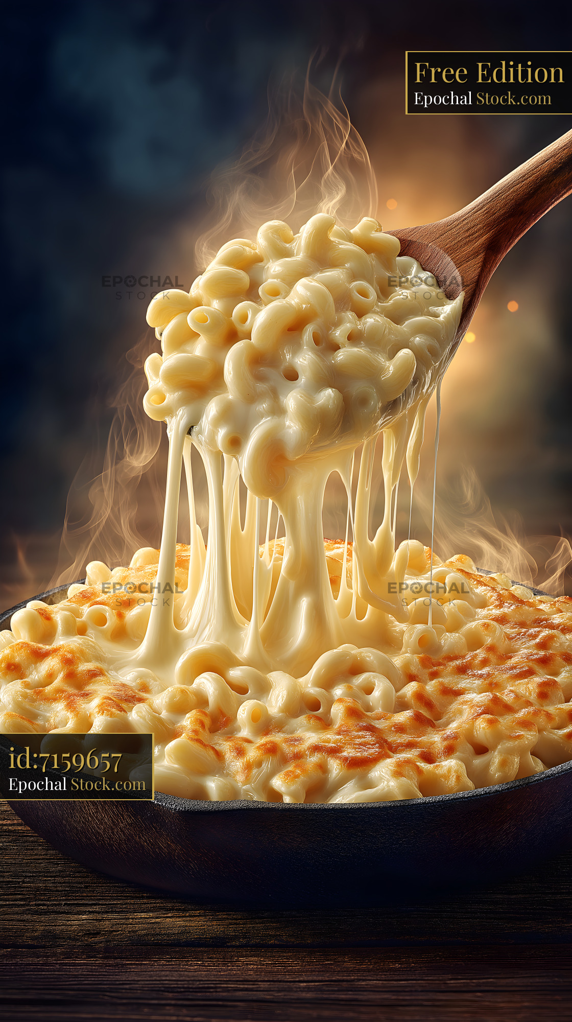 A wooden spoon lifts creamy macaroni from a bowl. Steam rises as the pasta stretches with cheese. The setting looks warm and inviting, perfect for enjoying a hearty meal.