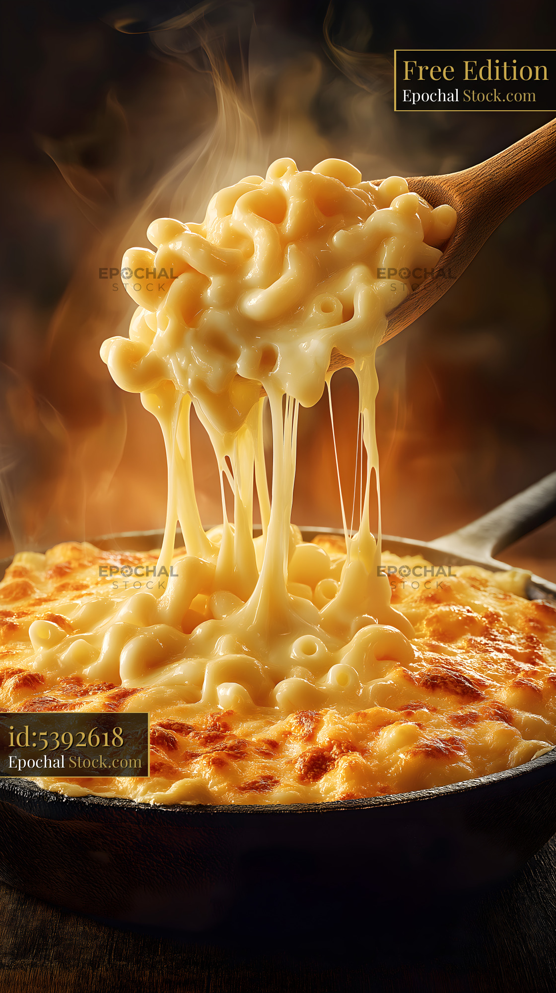 Steaming macaroni and cheese is pulled from a skillet. The cheese stretches as the serving spoon lifts the pasta. The scene shows a warm, inviting meal ready to eat.