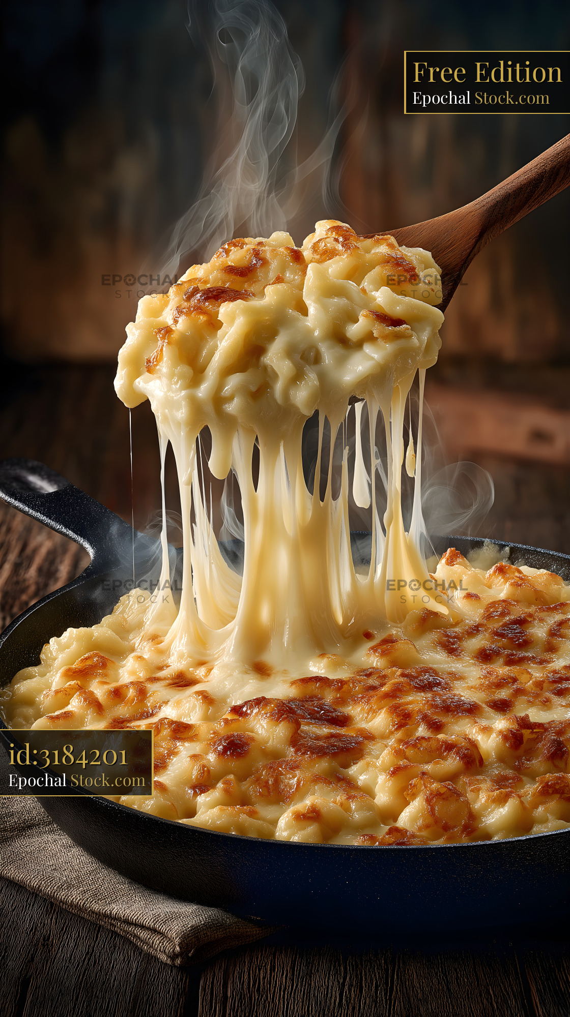 A skillet holds a dish of cheesy pasta. Steam rises from the creamy, melted cheese. The pasta is golden and bubbly, ready to serve. A wooden spoon is lifting a portion from the skillet.