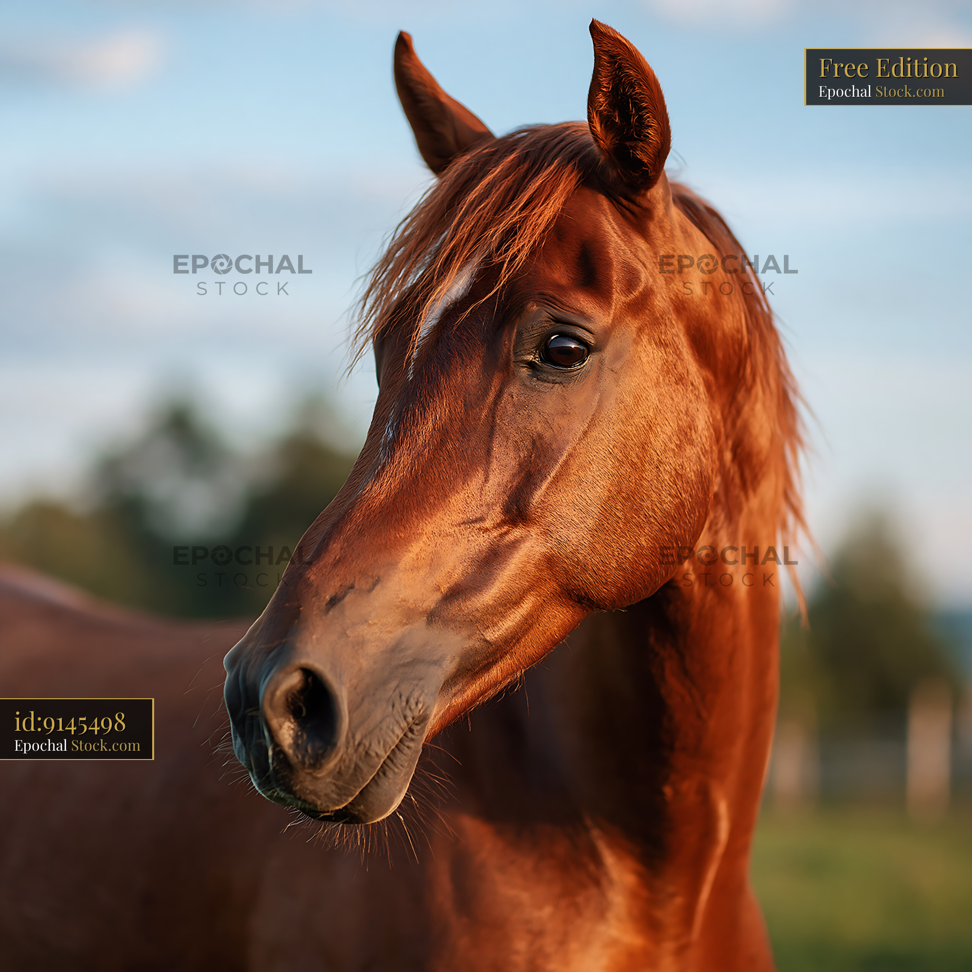 A striking chestnut horse with flowing mane gazes directly at the camera in warm golden hour light, capturing a moment of quiet dignity and connection. The soft-focused rural background and natural lighting evoke themes of freedom, strength, and the bond between human and animal.