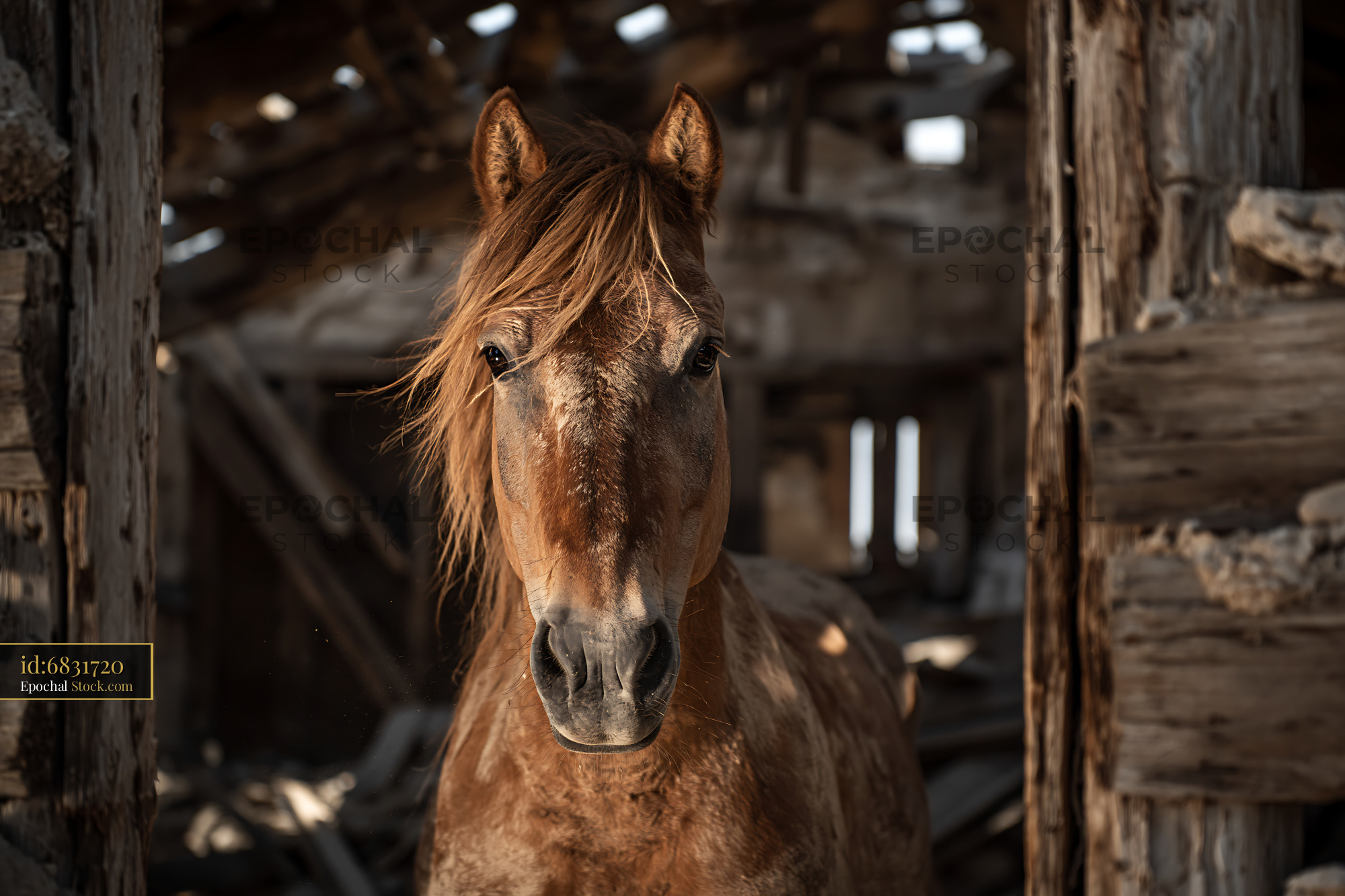 A chestnut horse looks out from a dilapidated wooden stable, capturing a sense of quiet resilience and nostalgia within a weathered, rustic landscape.