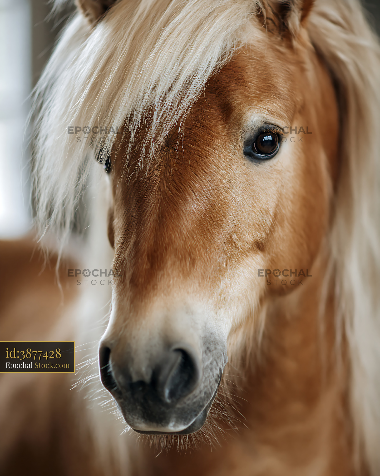 A striking close-up portrait of a chestnut horse with a flowing pale blonde mane, capturing the animal's gentle gaze and serene expression. The soft, blurred background emphasizes the horse's refined features and creates an intimate connection with the viewer.