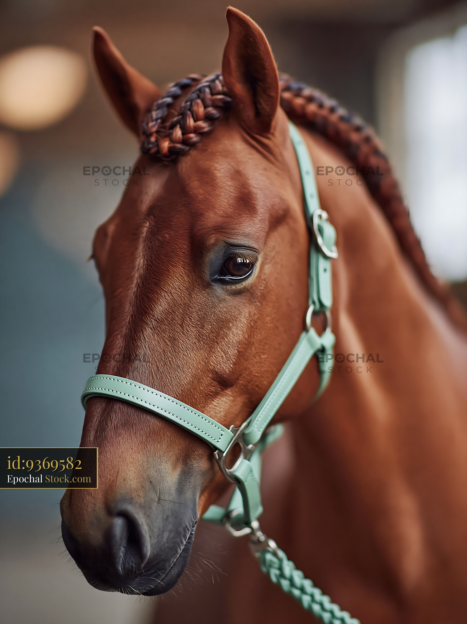 Close-up portrait of a well-groomed chestnut horse with a braided mane and teal halter, evoking themes of elegance, preparation, and professional equestrian sports.