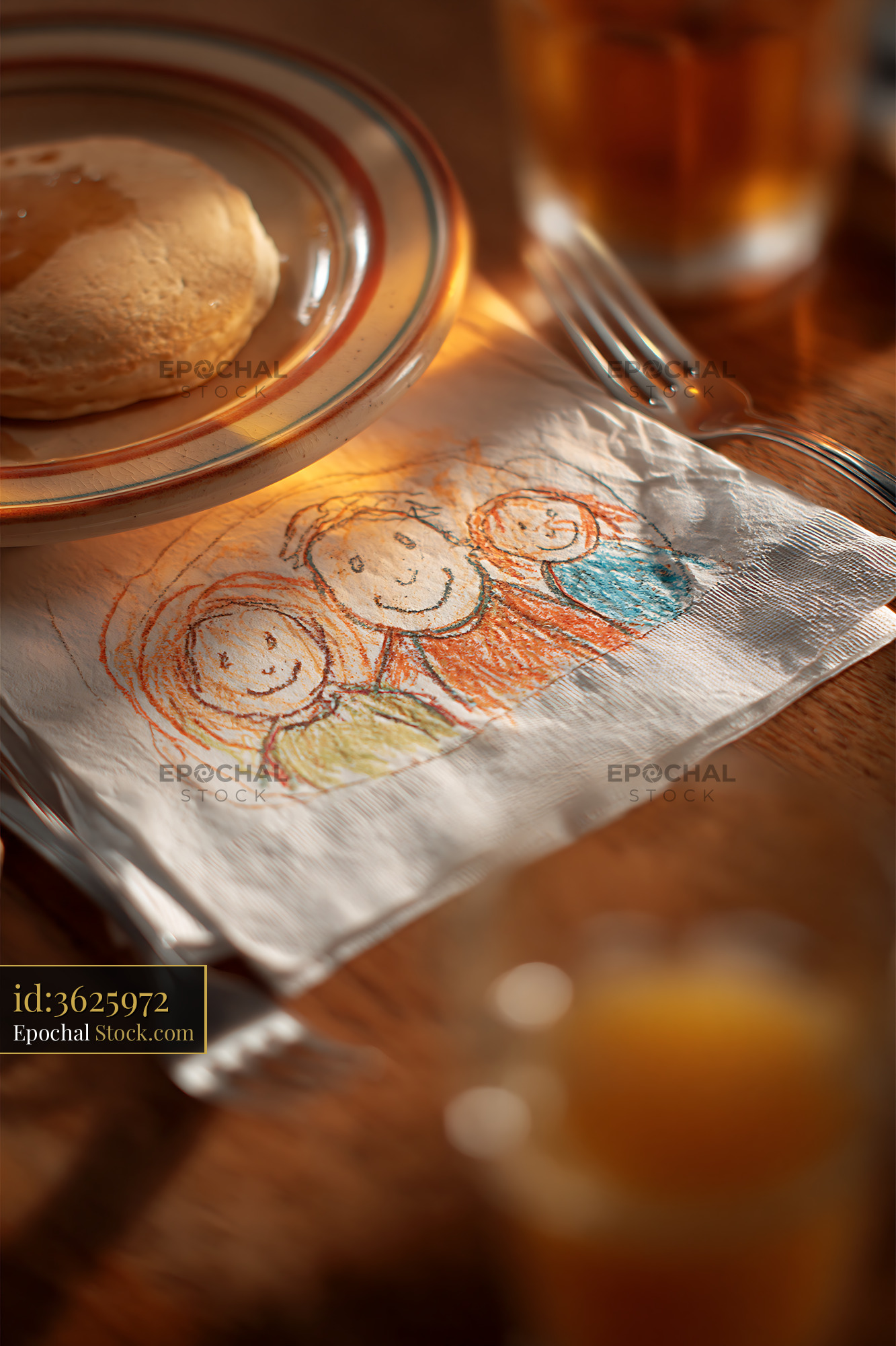 A heartwarming scene of a child's crayon drawing of a smiling family on a paper napkin, illuminated by warm morning sunlight next to a plate of pancakes and orange juice.