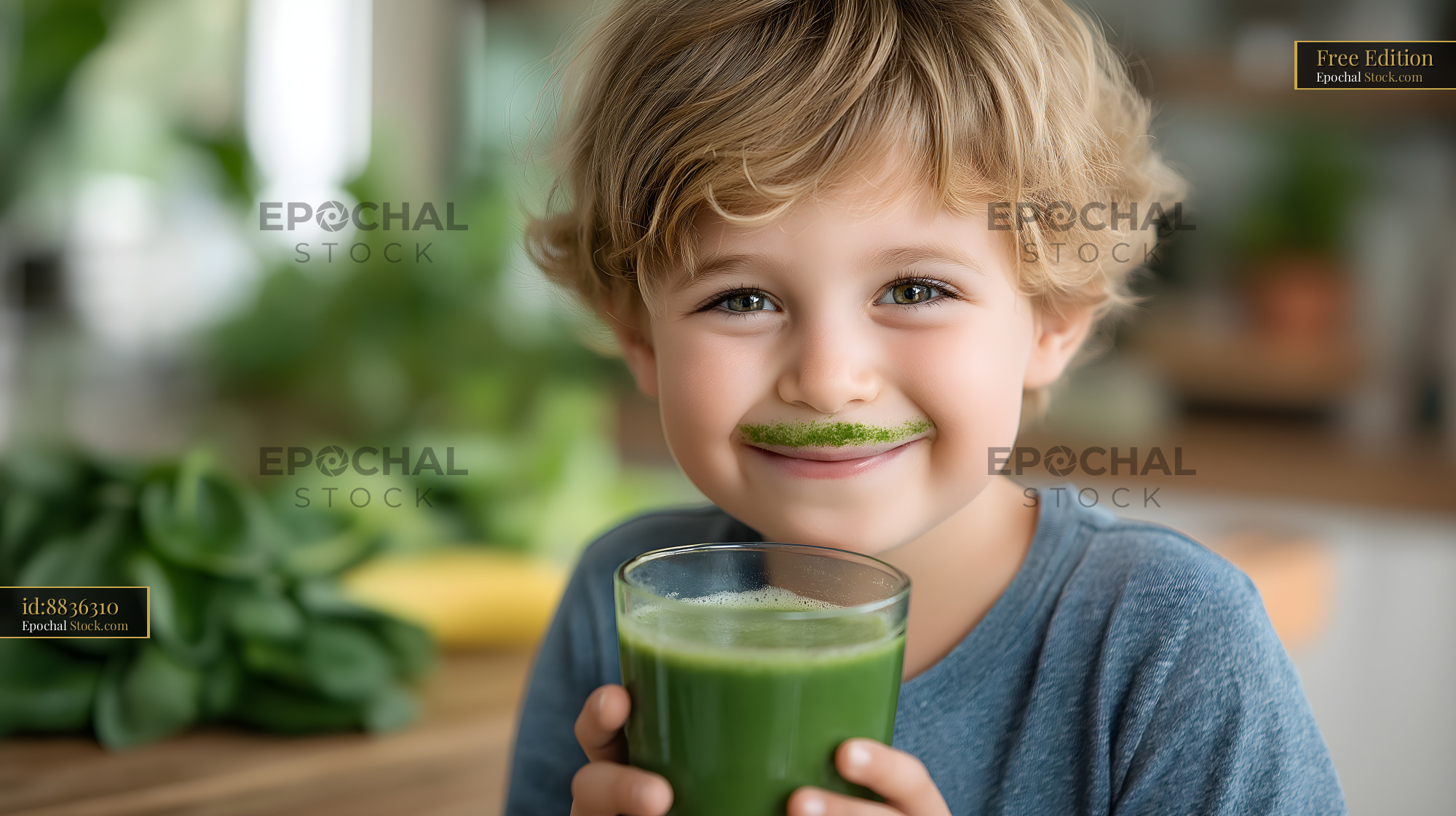 Child enjoys green smoothie in kitchen and smiles brightly Free Premium Stock Photo