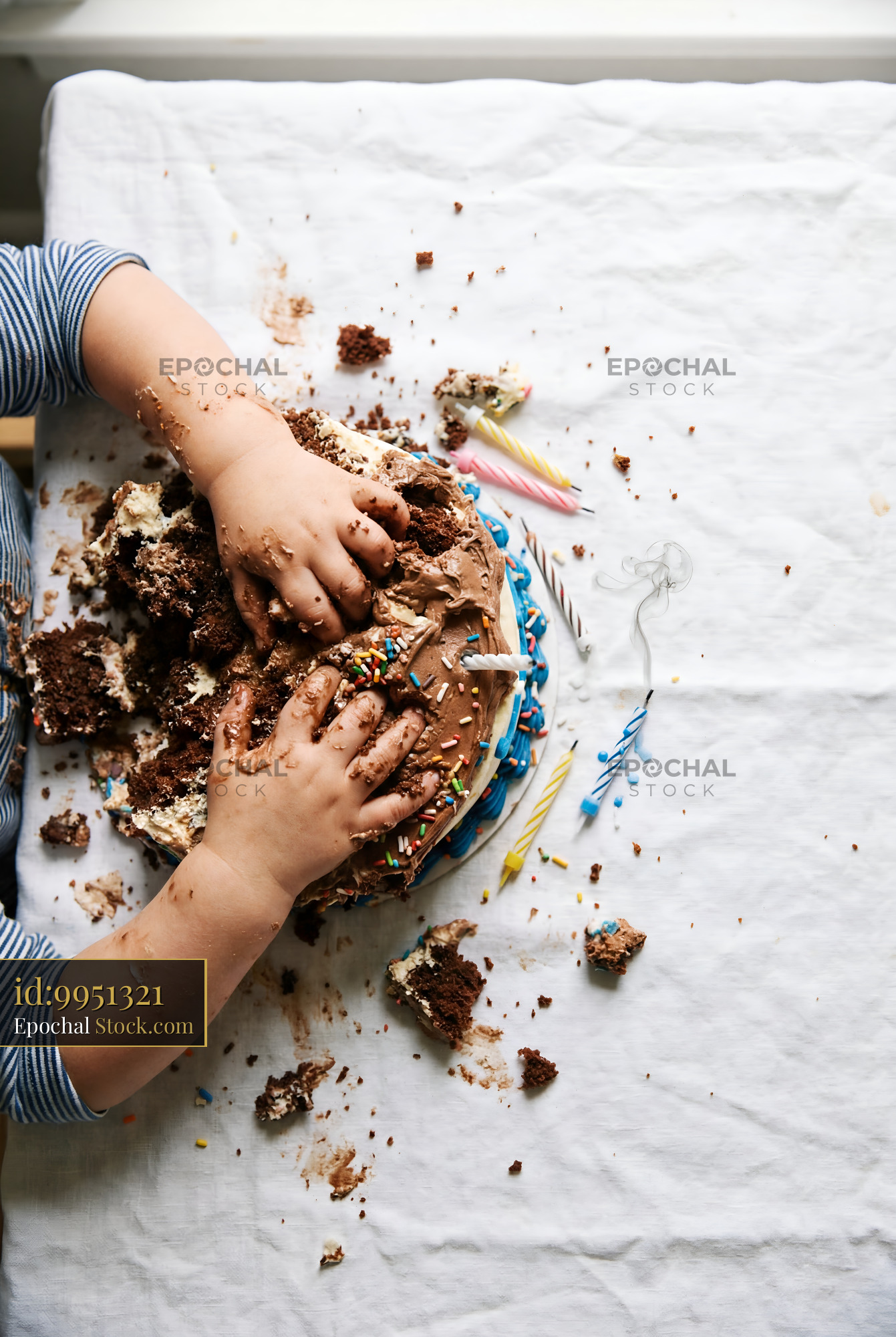 A child plays with a cake during a birthday celebration. The cake is mostly destroyed with crumbs scattered on a white tablecloth. Birthday candles are also present at the scene.