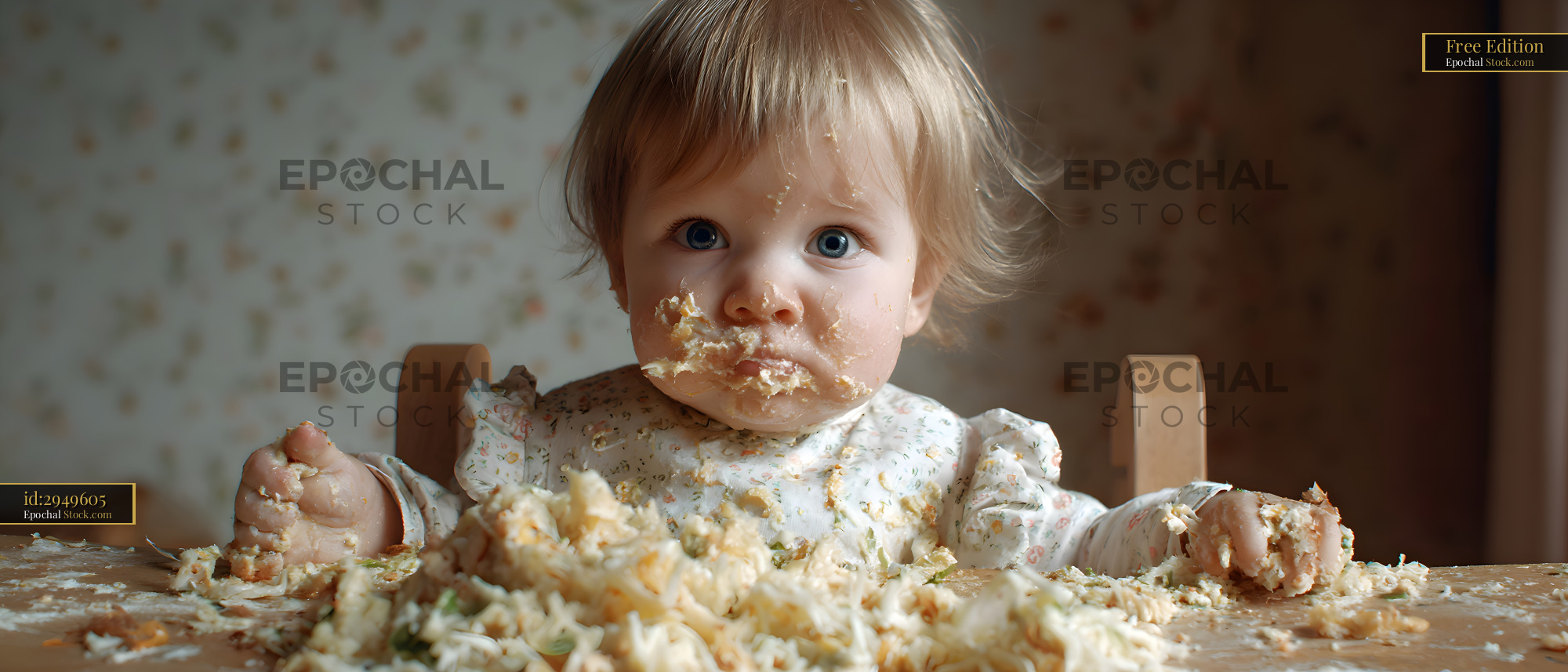 A small child sits at a wooden table with food all around. The child has food on their face and hands. They look curious and happy while exploring their meal. This scene takes place in a cozy kitchen.