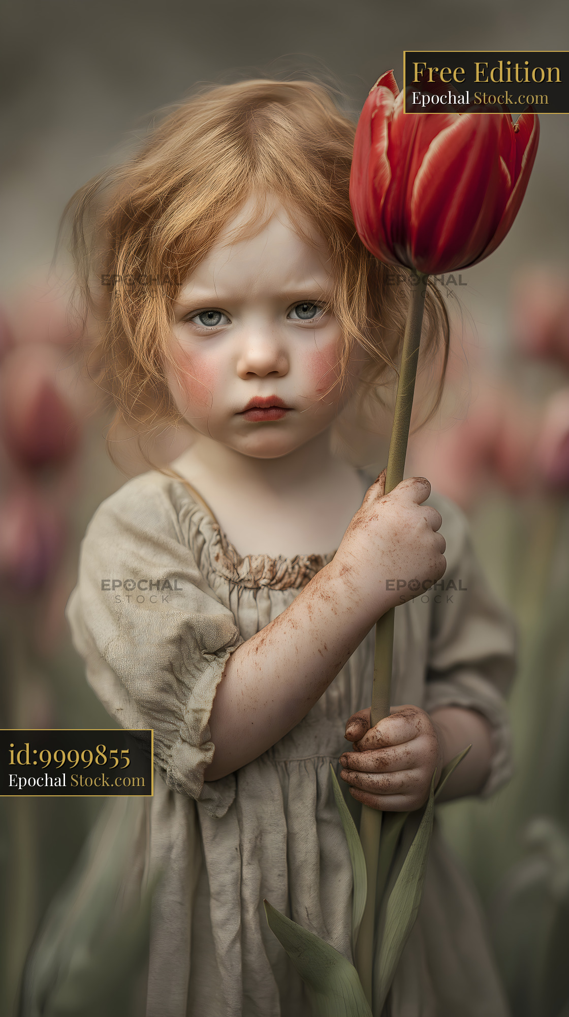 A young child stands in a field filled with tulips. The child holds a bright red tulip and looks at the viewer. The setting is bright and sunny with soft colorful flowers all around.