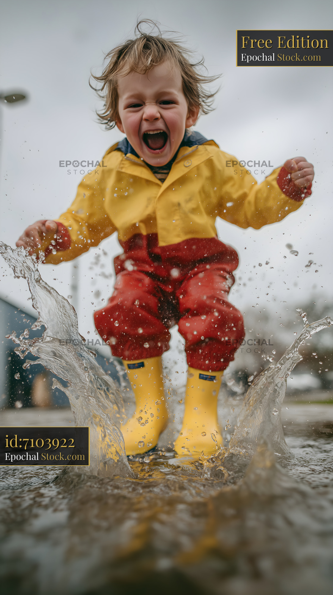 Child jumps and splashes in puddles on a rainy day Free Premium Stock Photo