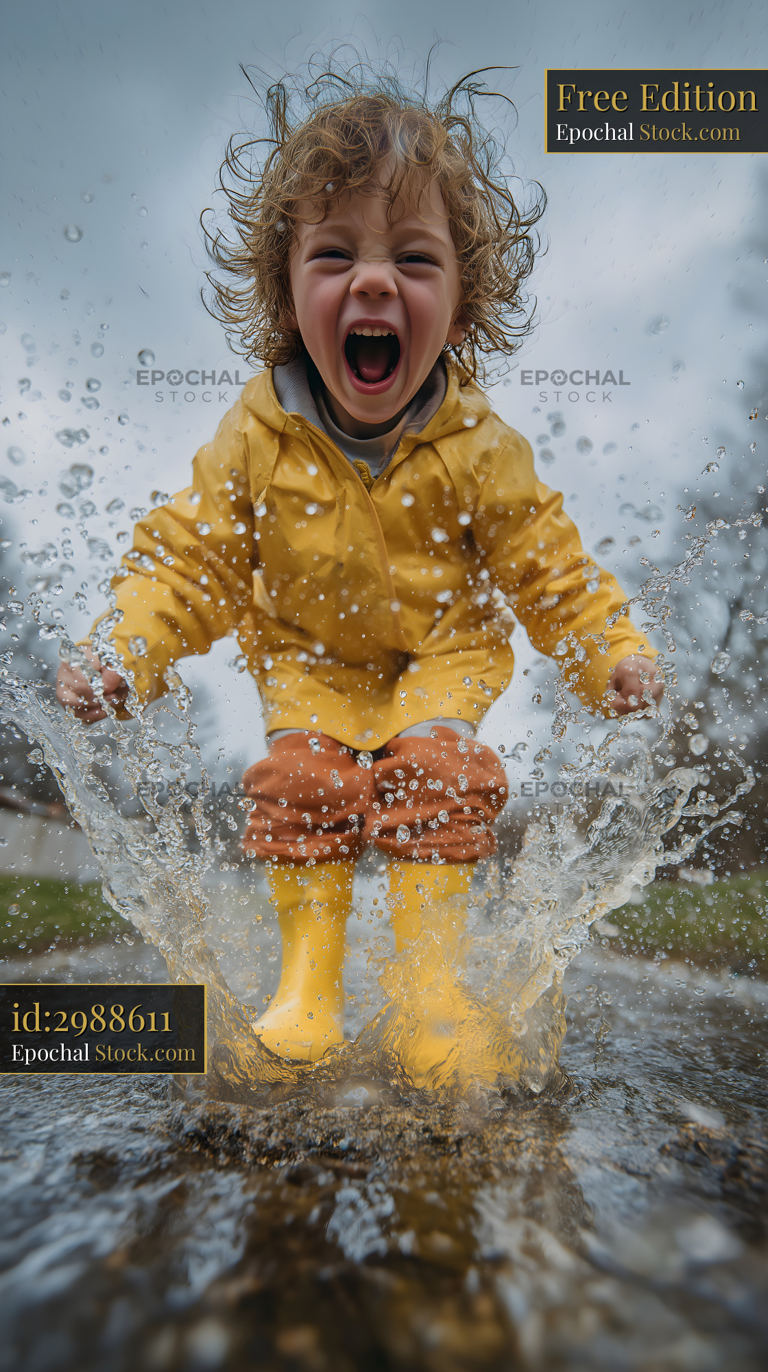 Child jumps in puddle on rainy day in yellow rain gear Free Premium Stock Photo