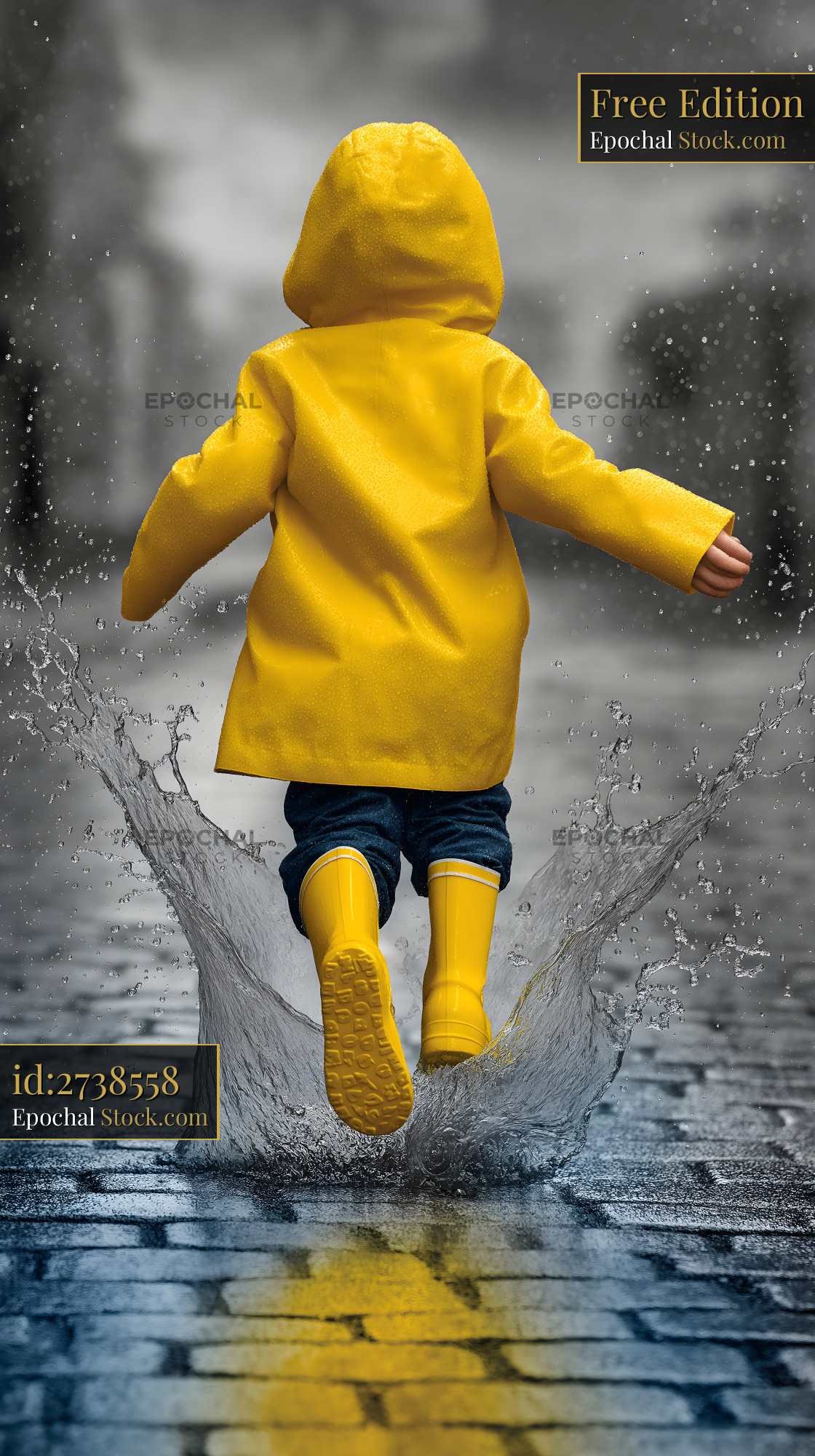 A child in a yellow raincoat and boots jumps into puddles on a wet street. Water splashes around as the rain falls and the gray sky looms above, creating a fun moment in the rain.