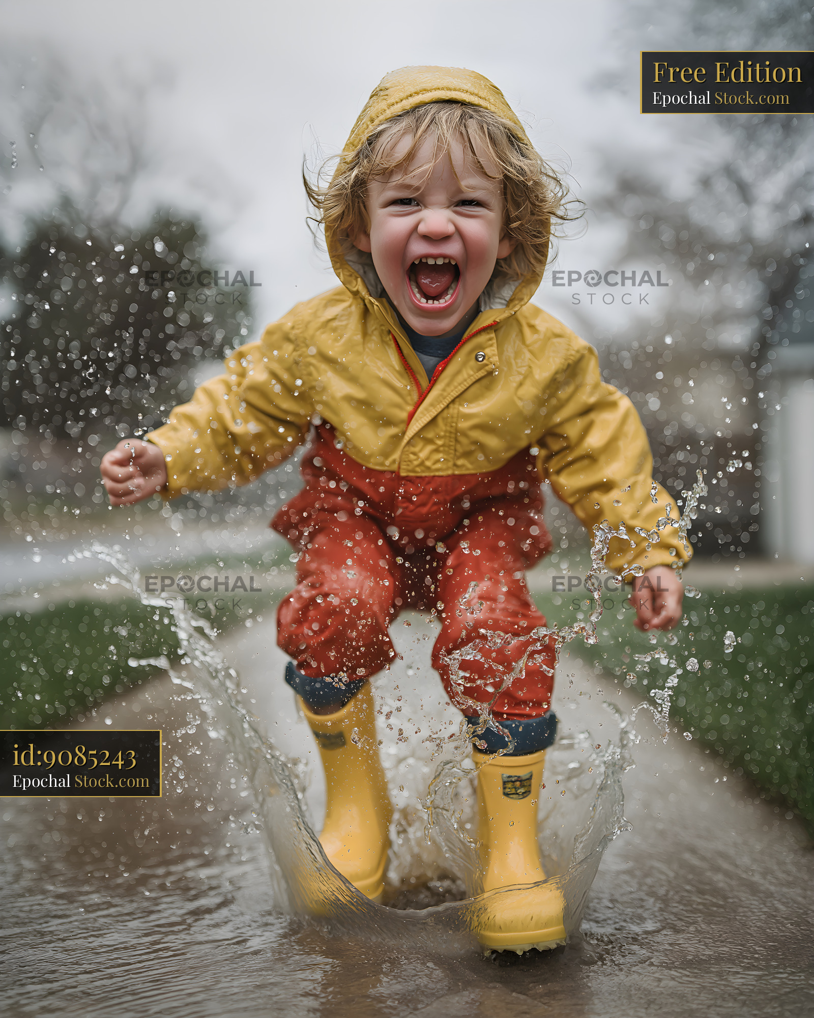A child in a yellow raincoat and rubber boots is having fun. The child laughs while jumping in puddles and splashing water. It is a rainy day and everything is wet.