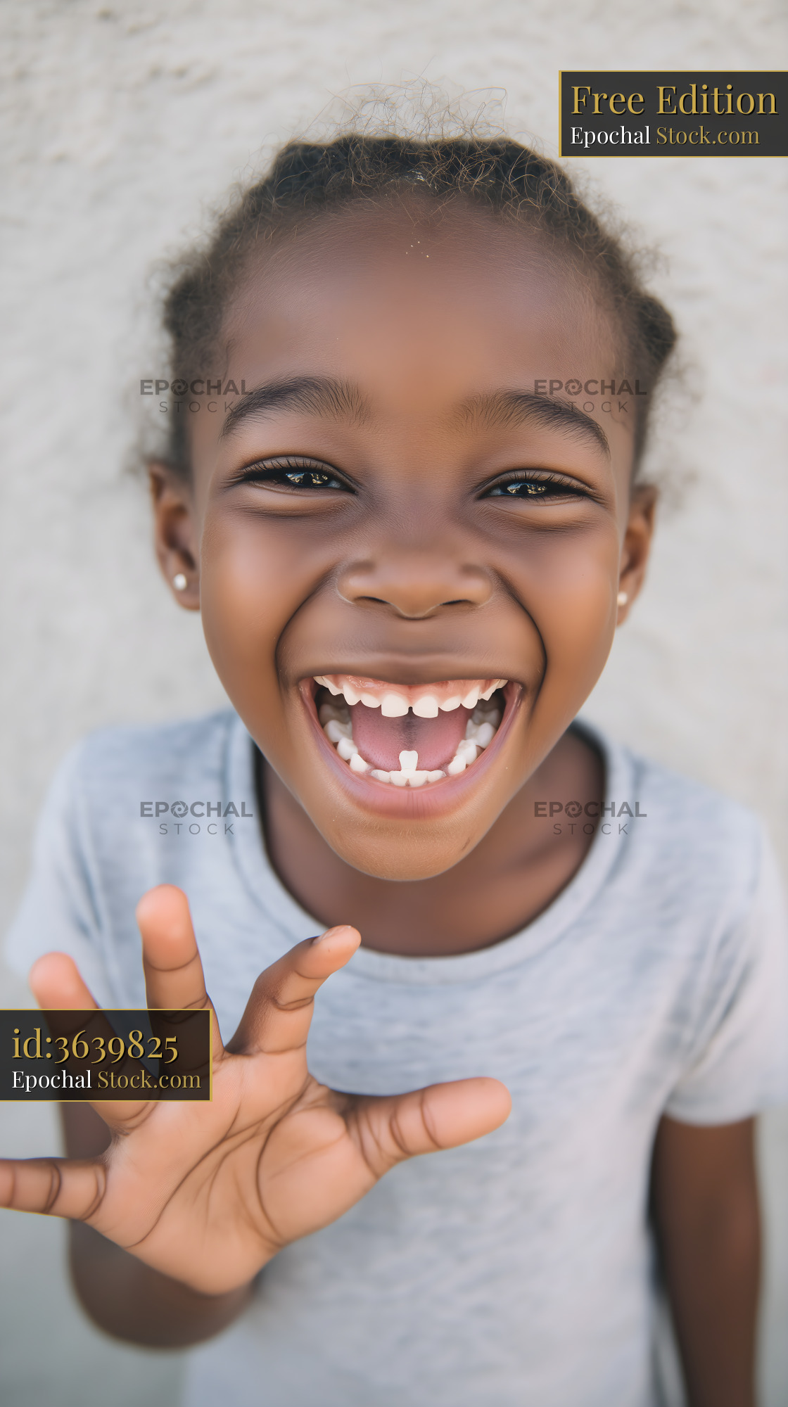 Child laughs and waves while standing against a wall Free Premium Stock Photo