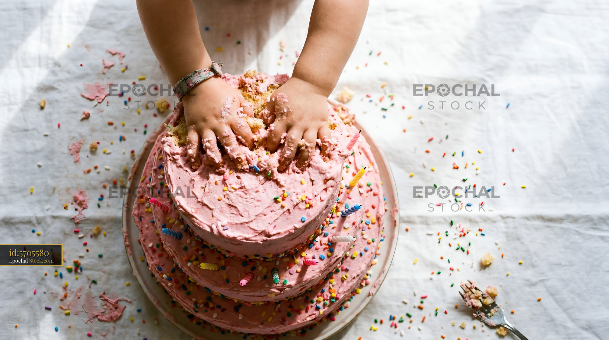 A young child is using both hands to play with a pink birthday cake at a celebration. The cake has sprinkles on it and sits on a table. Crumbs are scattered around.
