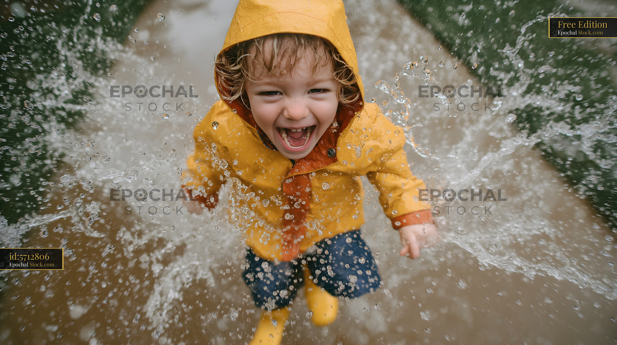 A young child wearing a yellow raincoat jumps in puddles. Water splashes around as the child laughs and enjoys the rain. The scene shows excitement and fun during a rainy day.