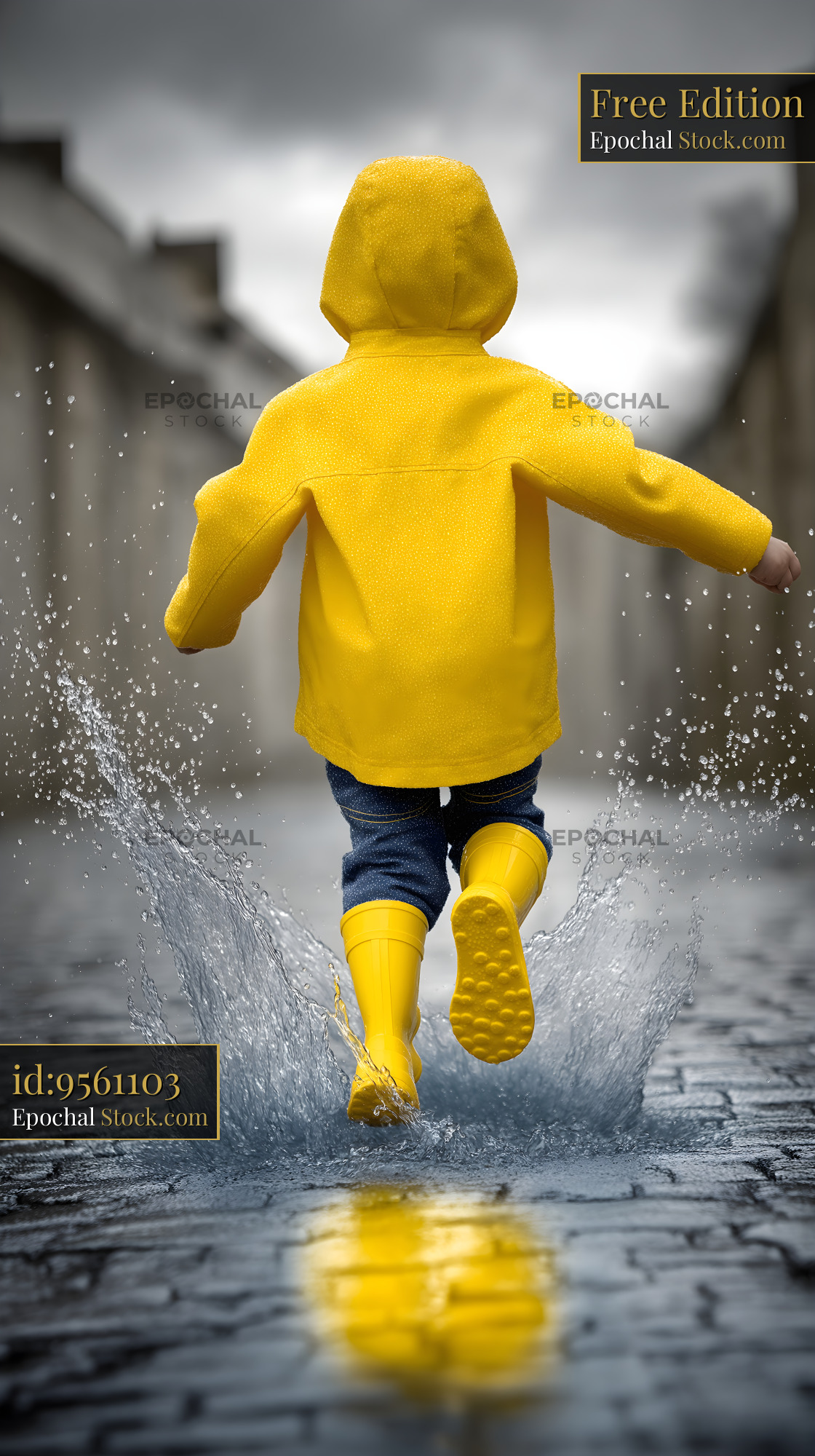 A child runs through puddles on a wet street. The child wears a yellow raincoat and yellow boots. Water splashes around as the child enjoys a rainy day in the city.