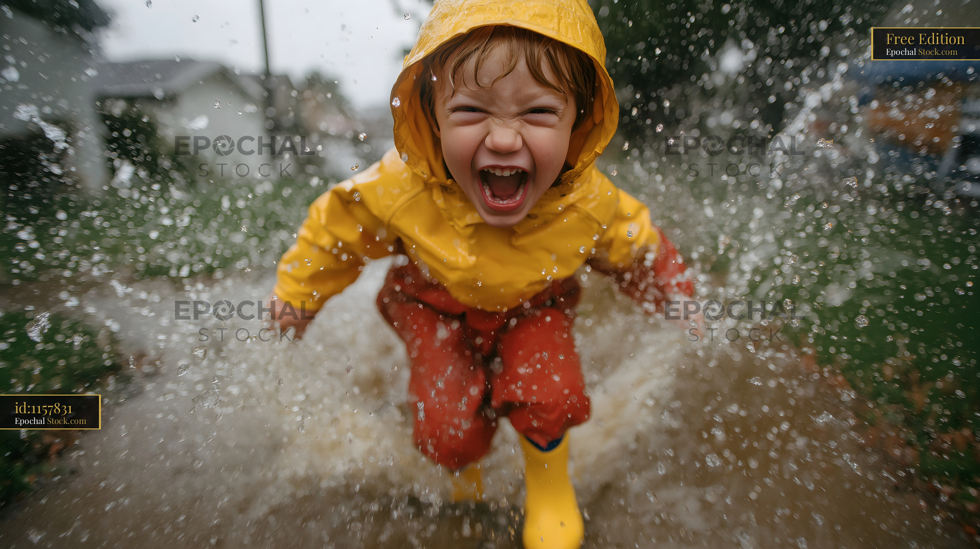 Child plays in rain puddle with yellow rain gear and joy Free Premium Stock Image