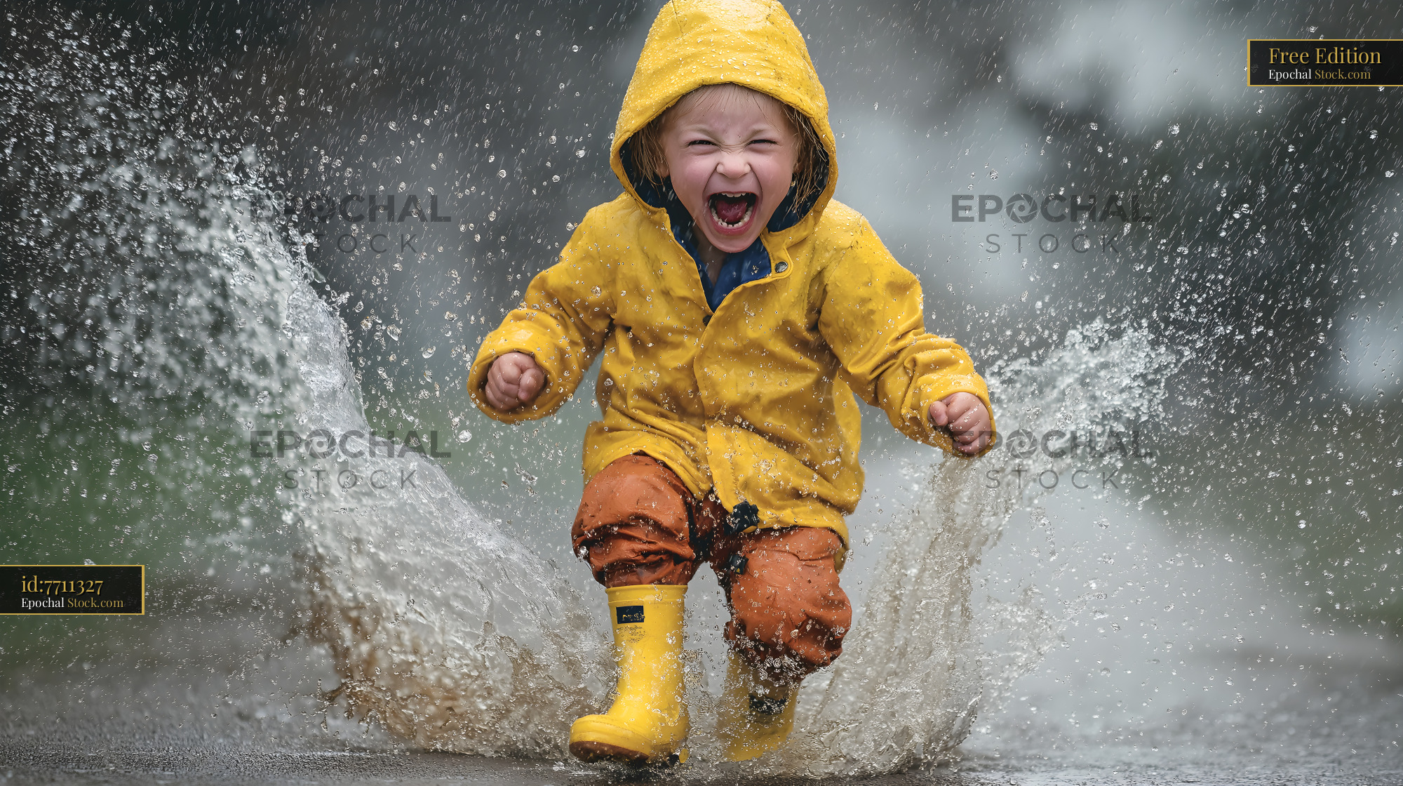 A child runs and splashes in puddles while wearing a yellow raincoat and yellow boots. Rain falls around, and the child shows joy with a big smile. The scene is lively and fun.