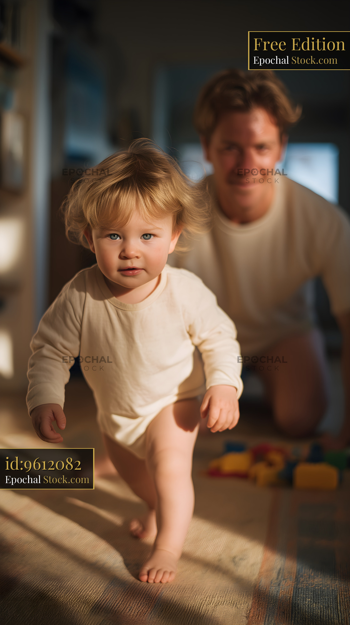 A child with light hair runs on a carpet toward a smiling parent. The setting is a cozy indoor space with natural light coming through the window. Bright colored blocks are nearby.